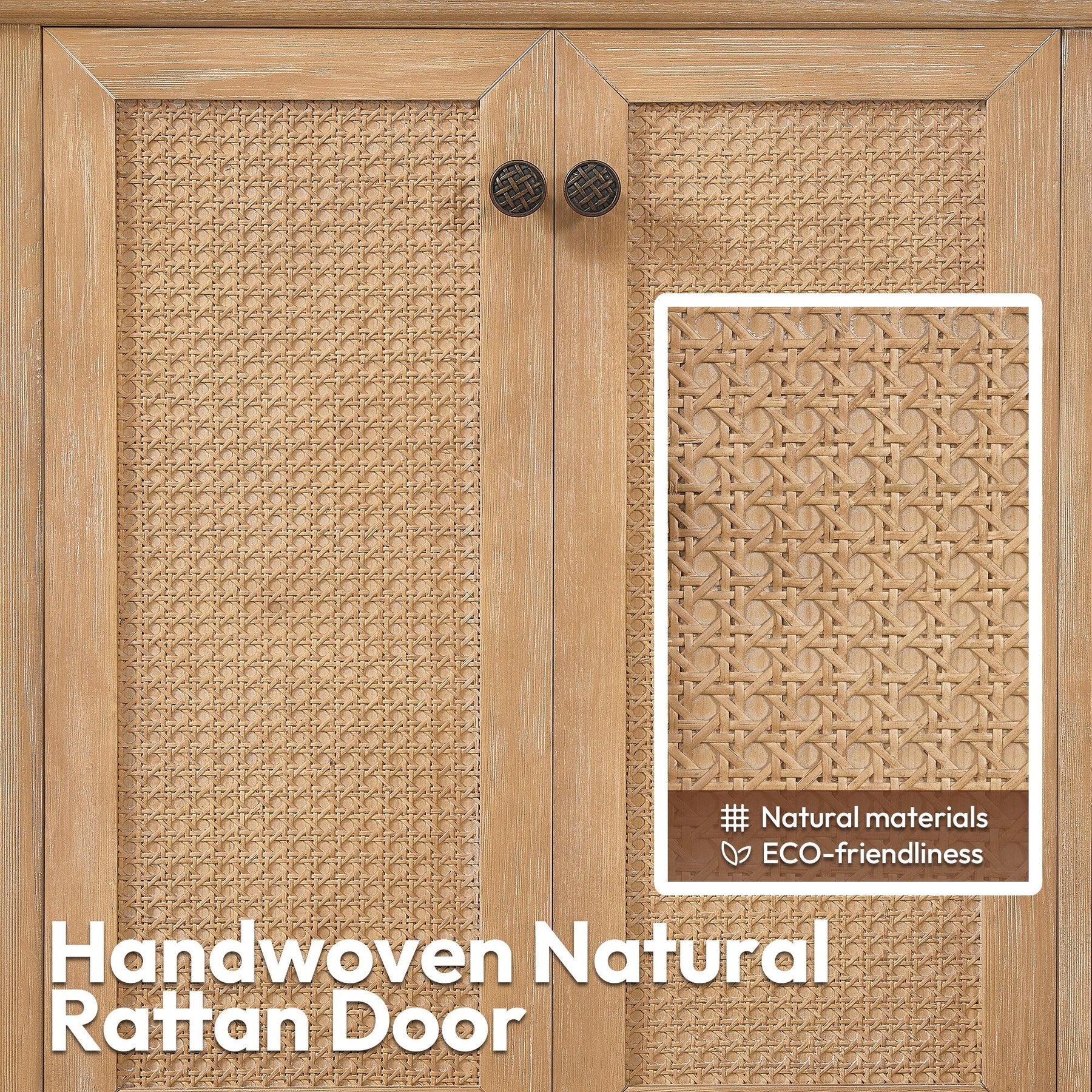 70 pouces - Quatre portes à fermeture douce avec un panneau en rotin et bambou et trois tiroirs à queue d'aronde robustes à fermeture douce.