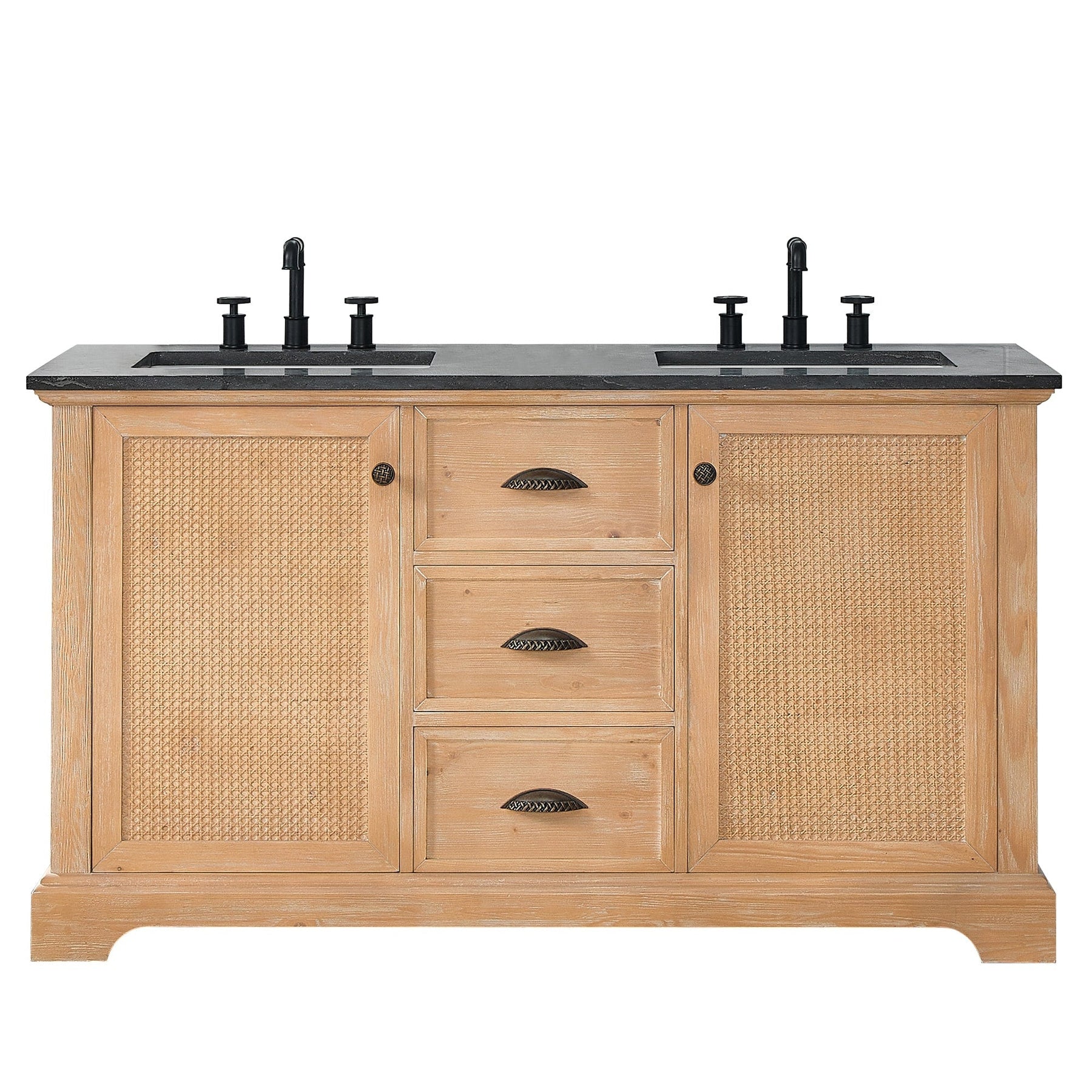 60 pouces - Deux portes à fermeture douce avec un panneau en rotin et bambou et trois tiroirs à queue d'aronde robustes à fermeture douce.