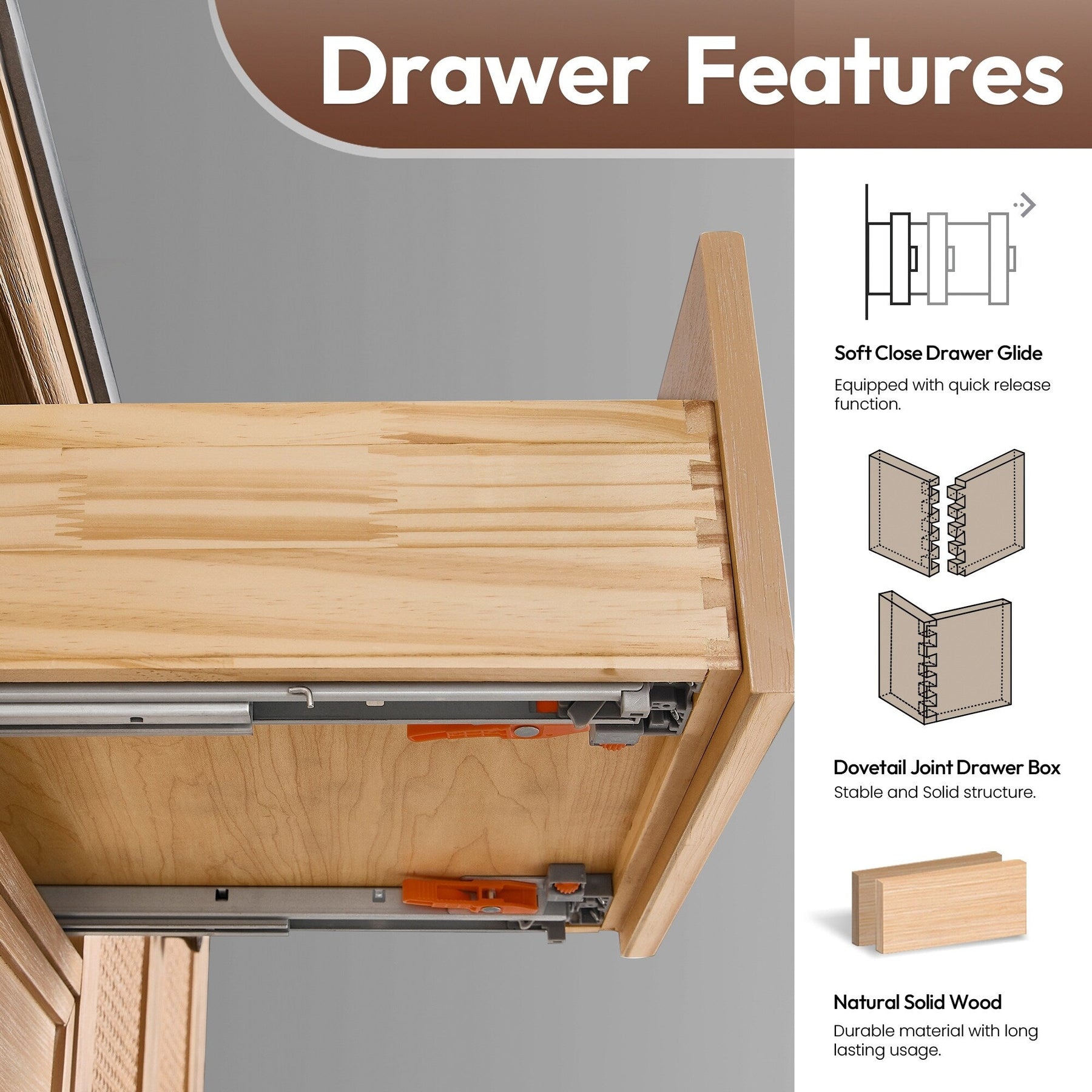 36 pouces - Une porte à fermeture en douceur avec un panneau en rotin et bambou et trois tiroirs à queue d'aronde robustes à fermeture en douceur.