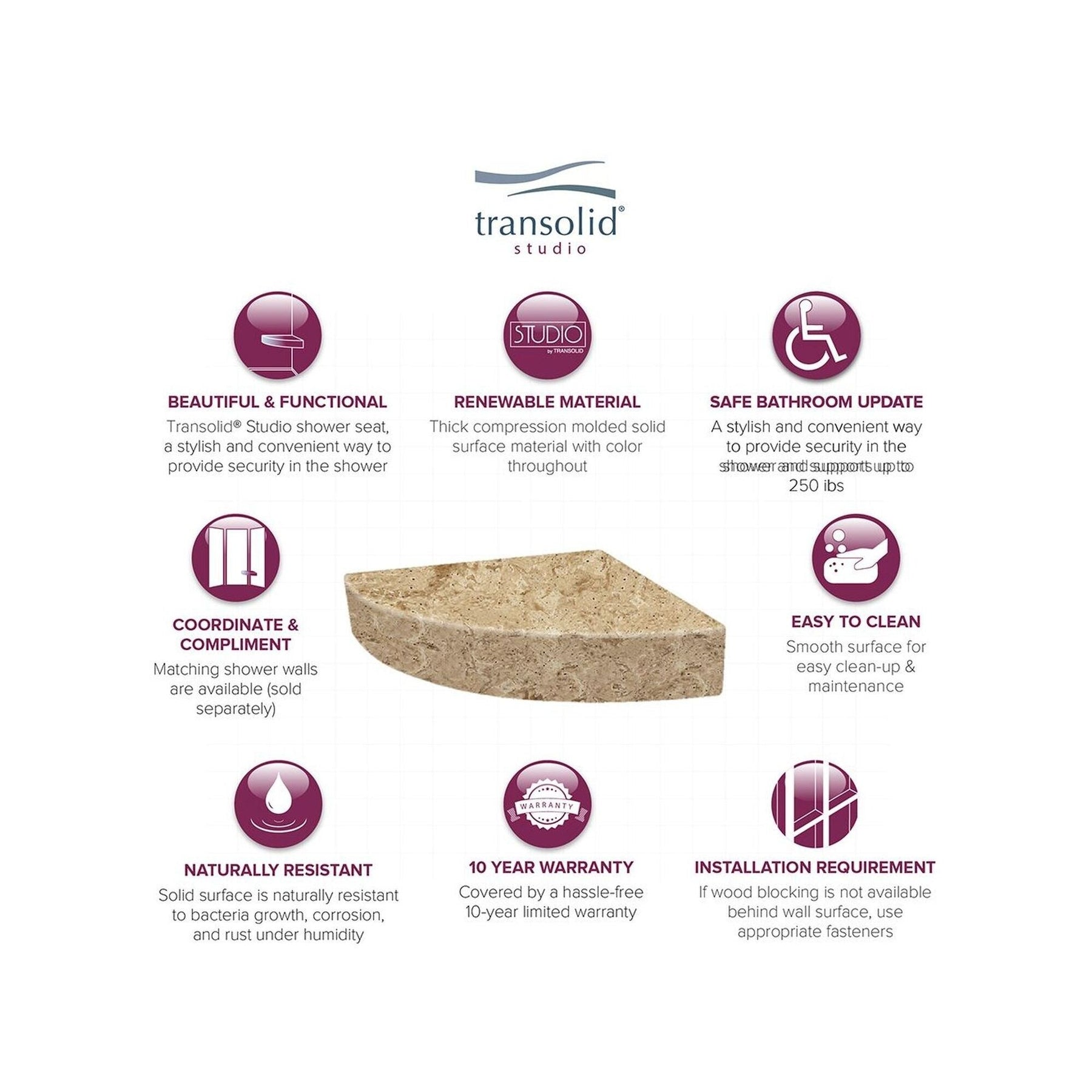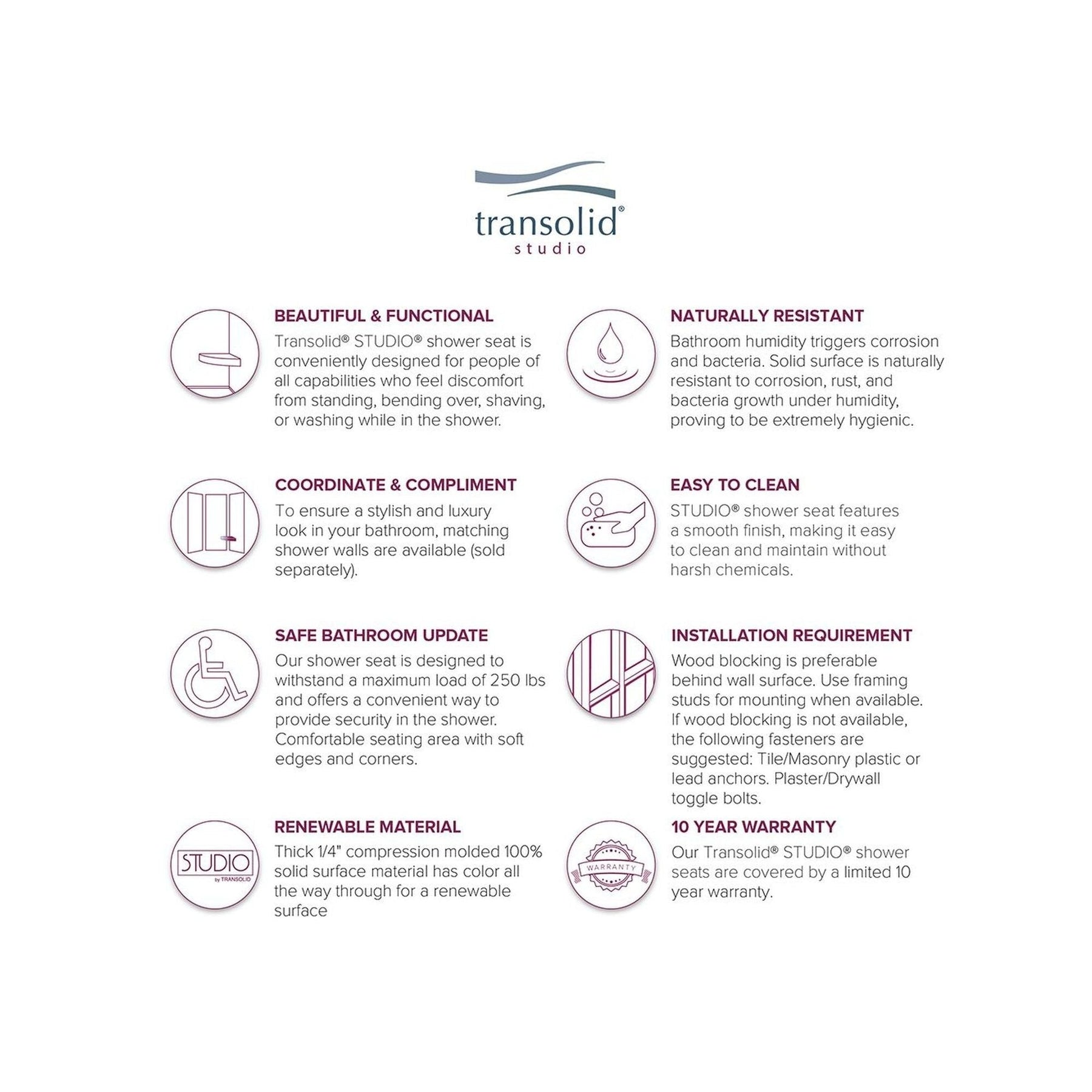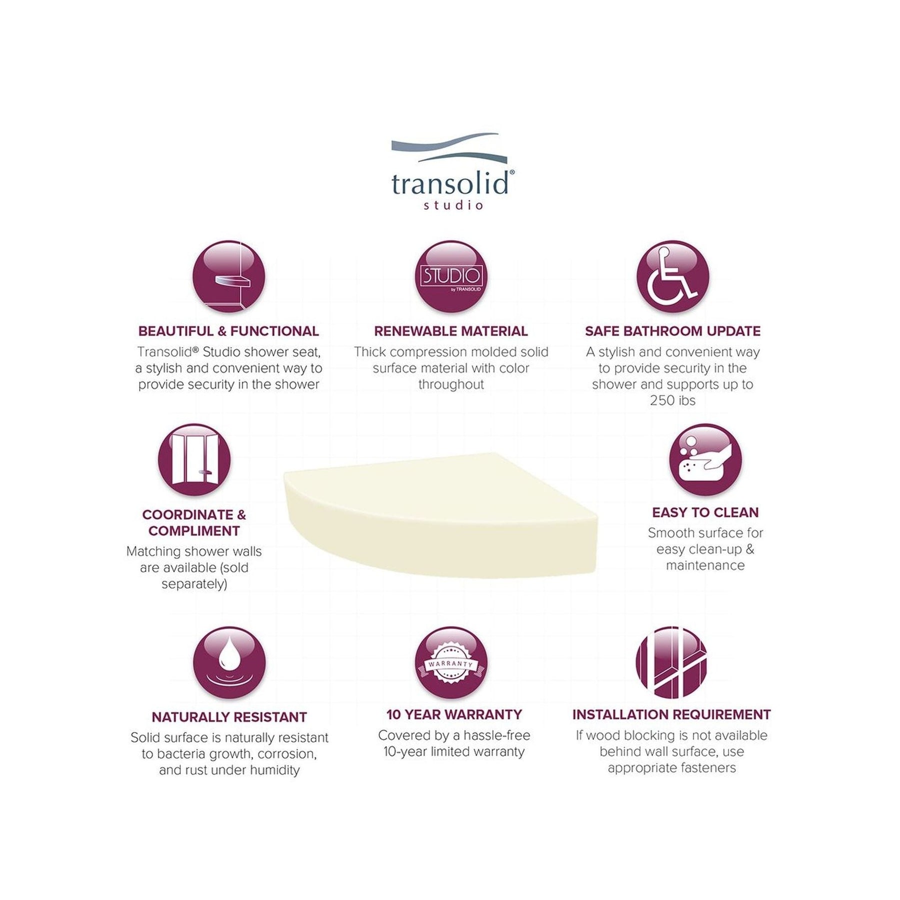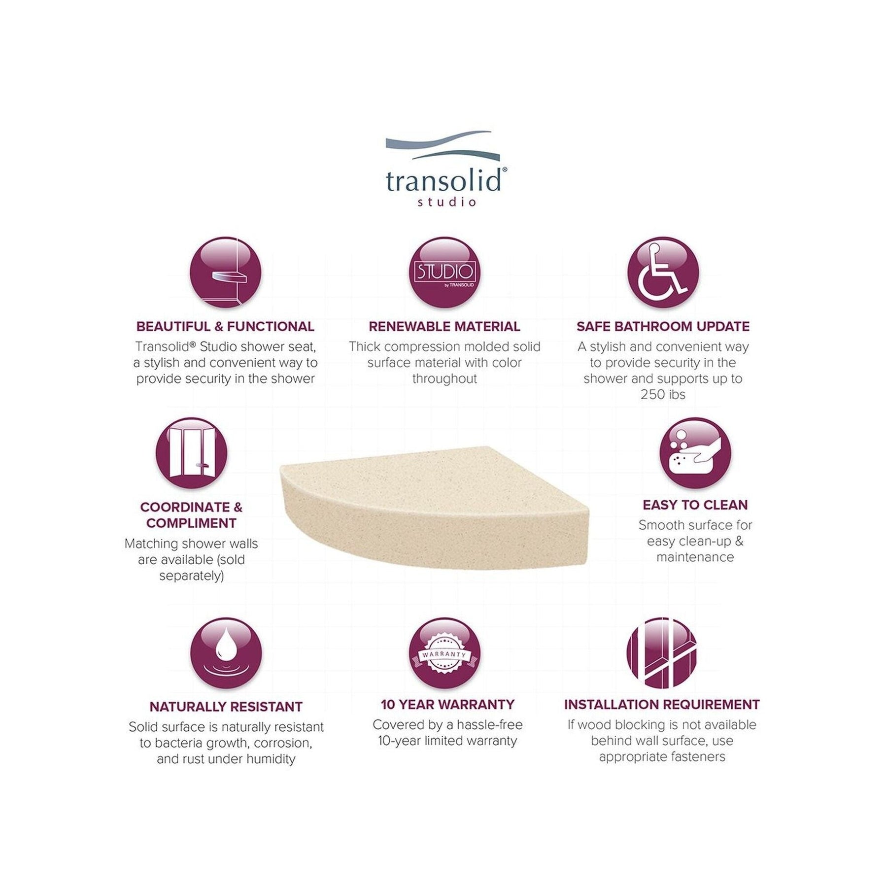 Siège de douche d'angle mural en surface solide Transolid Studio 14 po x 14 po - 14,5 x 14,25 x 3