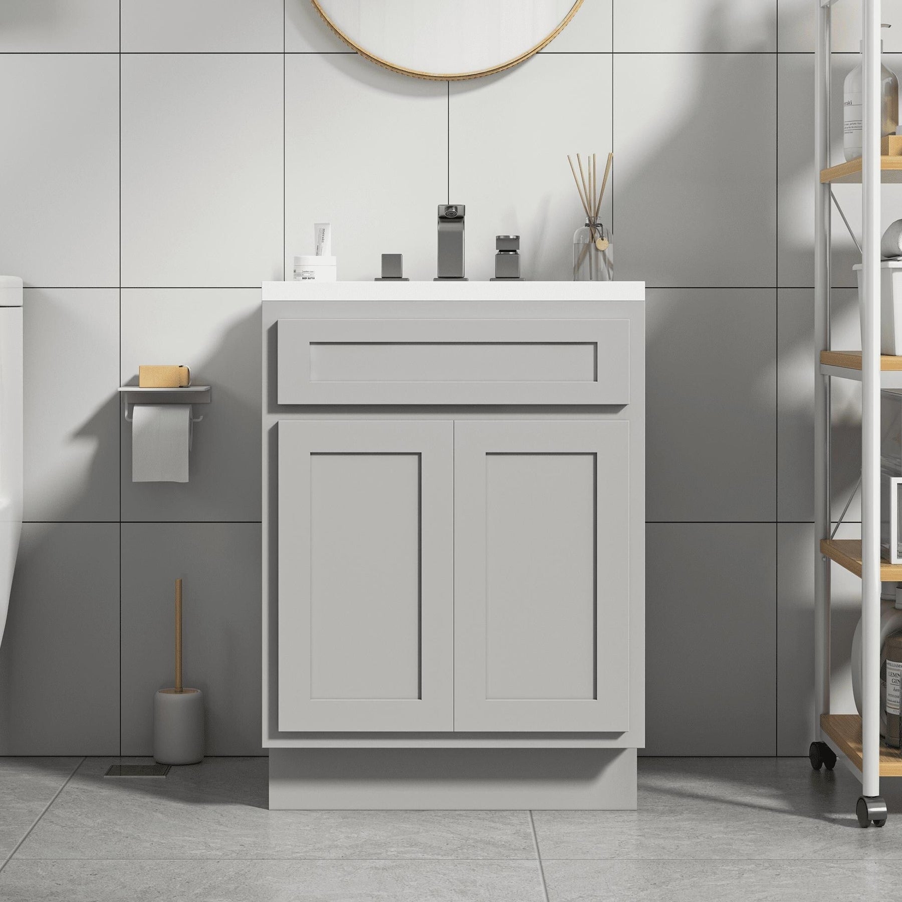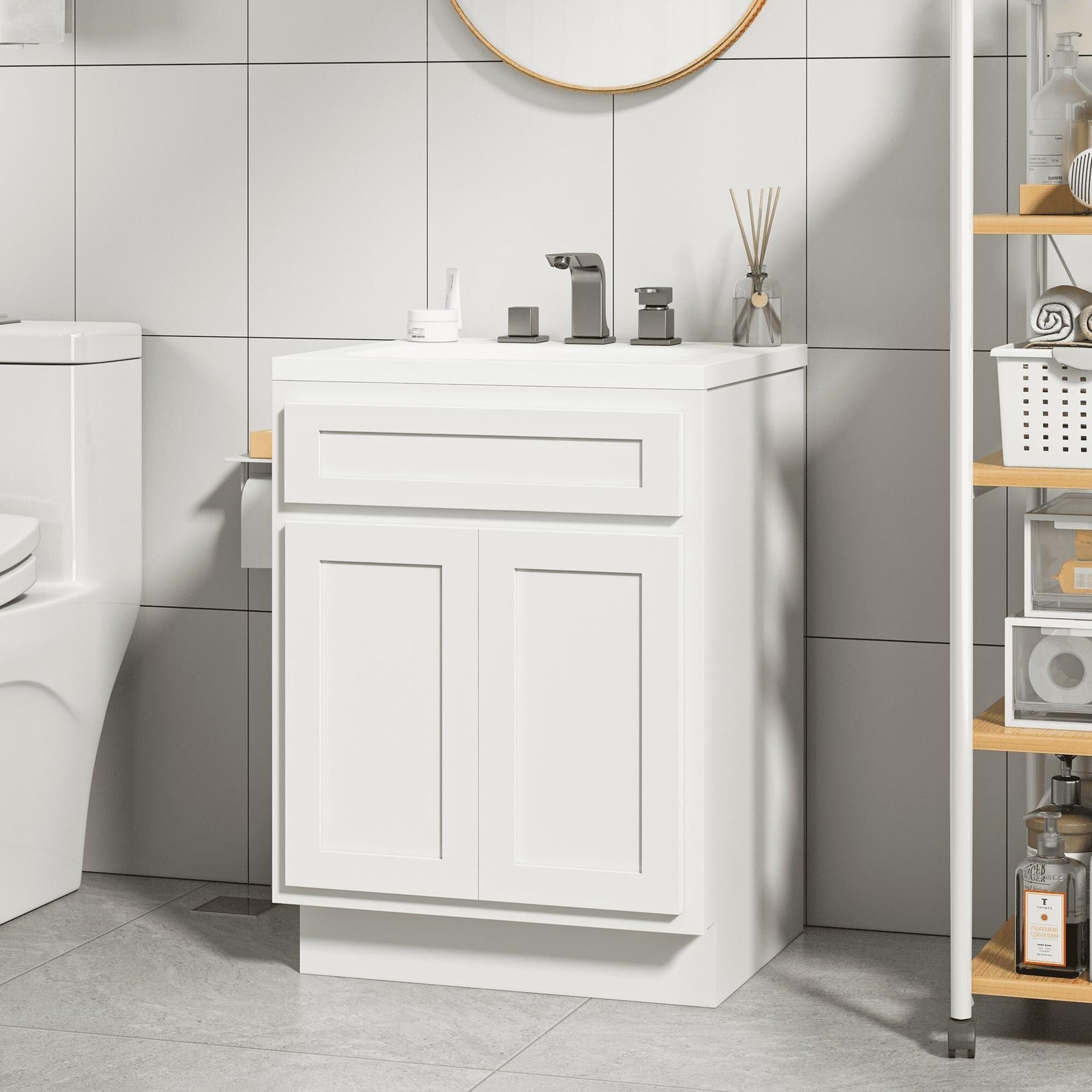 Vanity Art présente des meubles de salle de bain haut de gamme pour sublimer votre décoration, un atout indispensable à toute maison moderne. Fabriqués en chêne et contreplaqué de haute qualité, ces meubles sont conçus pour durer et vous permettent de tirer le meilleur parti de votre investissement. Ces meubles de salle de bain ou de cuisine offrent de nombreuses options de rangement, notamment des tiroirs, pour organiser soigneusement vos essentiels. Oubliez les plans de travail encombrés et profitez d'un espace plus organisé et efficace. Avec leur élégant design de style shaker, ces meubles de rangement à tiroirs offrent non seulement un rangement fonctionnel, mais rehaussent également la décoration de votre salle de bain. Leur motif intemporel apporte une touche de sophistication à tout espace. Les charnières métalliques des portes en contreplaqué garantissent durabilité et longévité, tandis que le mécanisme d'ouverture et de fermeture fluide des portes et des tiroirs simplifie l'utilisation. Polyvalents en taille et en forme, ces meubles de salle de bain trouveront également leur place dans votre chambre, votre salon, votre maison de campagne ou votre cuisine, ce qui en fait un ajout polyvalent à votre décoration intérieure.
