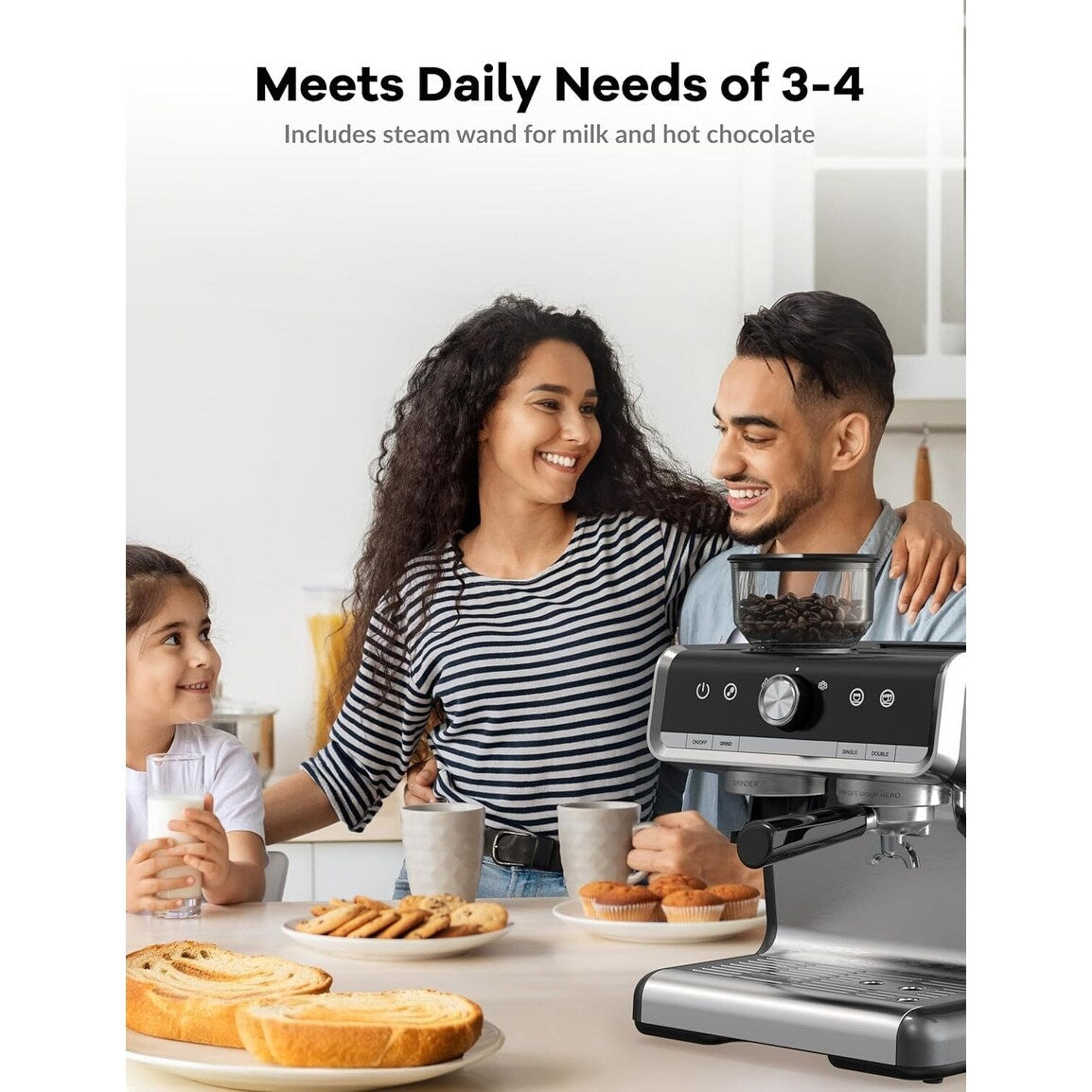 Machine à expresso professionnelle 20 bars : Notre machine à expresso semi-automatique tout-en-un est équipée d'une pompe professionnelle 20 bars et d'un puissant moteur de 1450 W, garantissant une extraction optimale pour un café plus riche et aromatique. Grâce à cette machine polyvalente, vous pouvez facilement préparer des cappuccinos mousseux, des lattes onctueux ou des expressos corsés, à la maison comme au bureau. Machine à café avec mouture : La cafetière est équipée d'un moulin à meules coniques en acier inoxydable avec 30 réglages de mouture, vous permettant de personnaliser la mouture, de fine à grossière. Sa conception antistatique réduit les salissures et assure une mouture uniforme. Buse à mousse de lait professionnelle : La puissante buse à vapeur rotative à 360 degrés vous permet de créer une micro-mousse de lait sans effort, rehaussant ainsi la saveur et facilitant la création de cafés maison. Obtenez une mousse de lait parfaite pour vos cappuccinos ou du lait chaud pour vos lattes, offrant une expérience digne d'un café et stimulant votre créativité pour créer des mousses de lait uniques. 【Contrôle précis de la température et grand réservoir d'eau】 - Cette machine à expresso est dotée d'un contrôle intelligent de la température PID, garantissant une distribution d'eau à la température précise pour une extraction optimale de l'expresso. Elle comprend également un réservoir d'eau amovible de 2,7 L, améliorant le confort et l'efficacité de la préparation et réduisant les remplissages fréquents. 【Facile à utiliser et à entretenir】 - Dotée d'un panneau de commande simple et clair permettant de sélectionner la vapeur, l'eau chaude et les doses simples ou doubles, cette machine à cappuccino avec moulin est extrêmement facile à utiliser. Son design élégant et compact s'adapte à toutes les tailles de cuisine et dispose d'un réservoir d'eau amovible et d'un bac d'égouttage pour un nettoyage facile.
