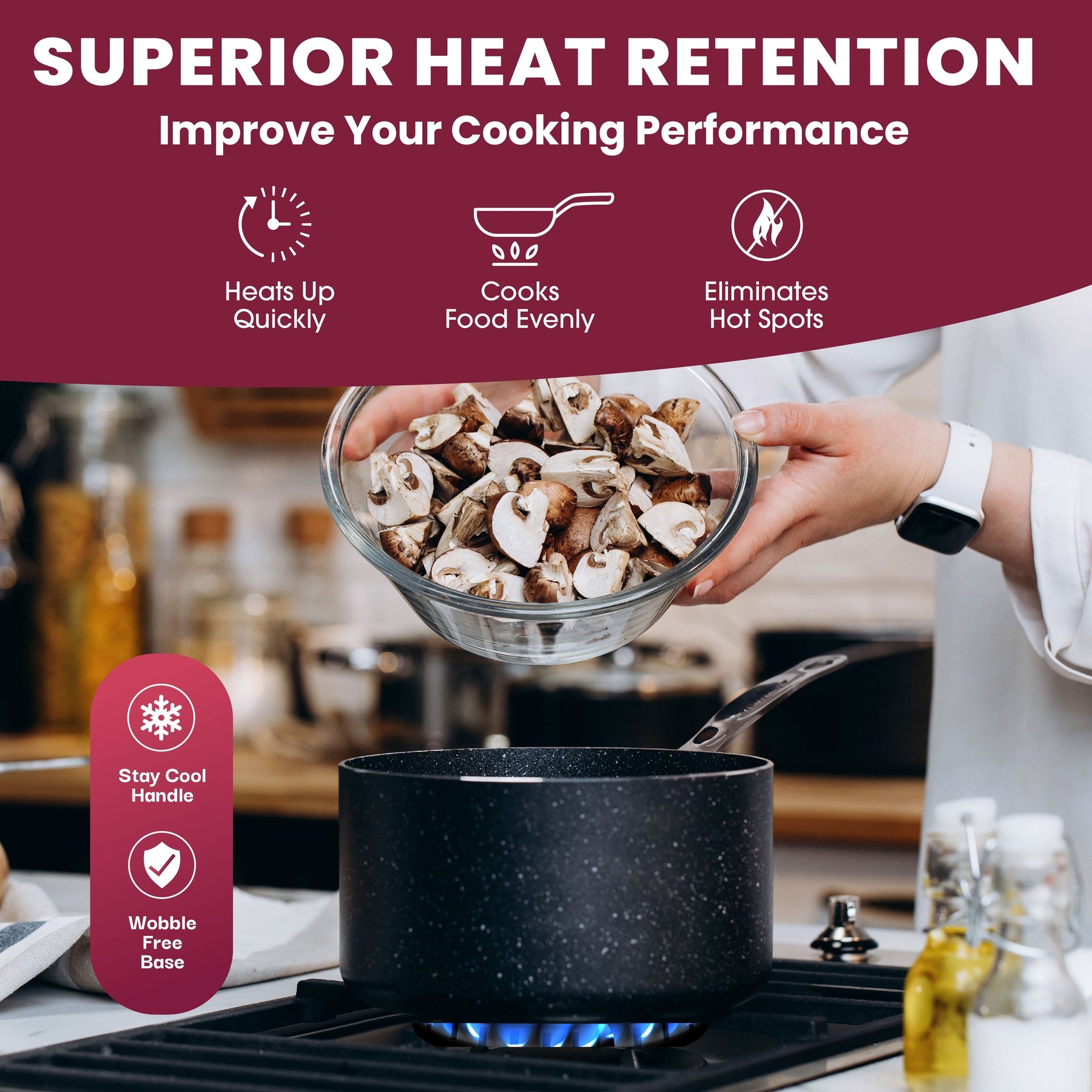 Sûr et adapté à la famille : fabriqué sans PFOA, PFOS, plomb ou cadmium pour une tranquillité d'esprit ; les poignées qui restent froides et les bases sans oscillation ajoutent sécurité et stabilité à chaque séance de cuisson.