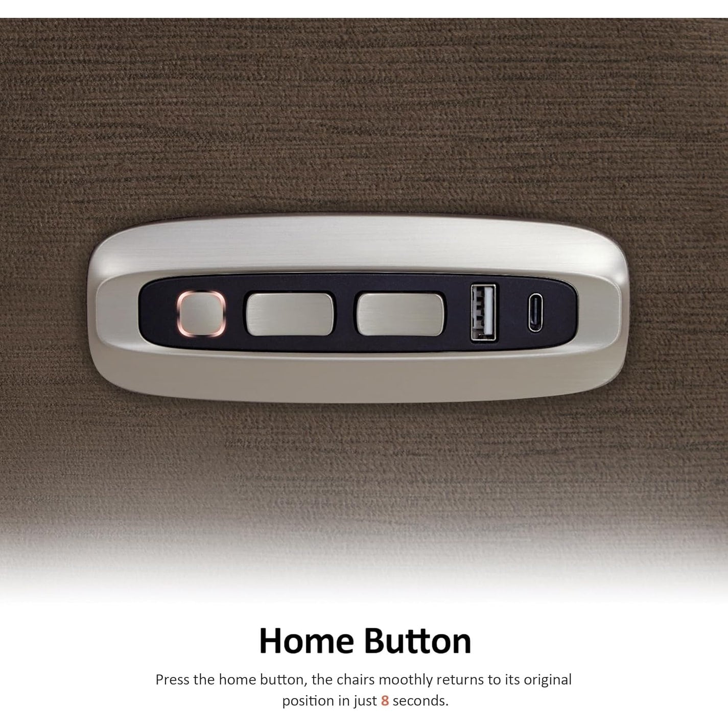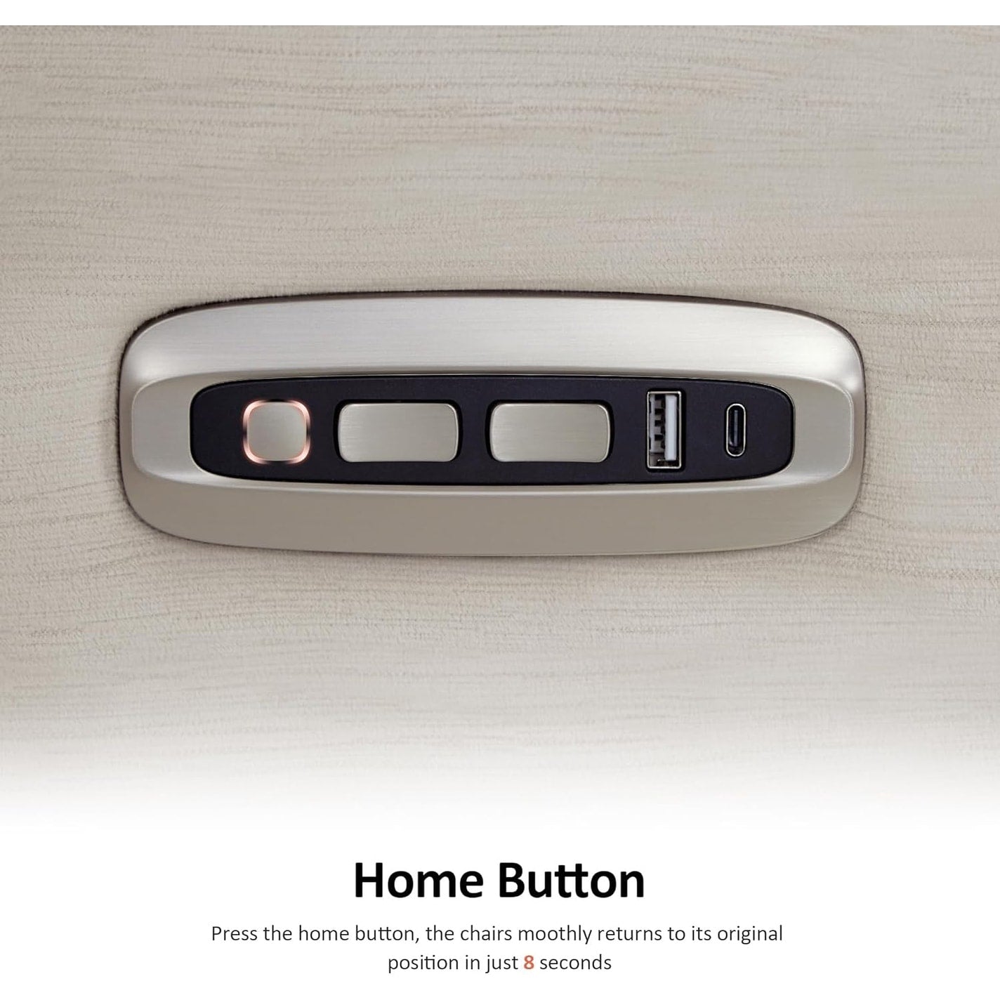 Manette intuitive. Appuyez sur le bouton d'accueil et le fauteuil revient en douceur à sa position initiale en seulement 8 secondes. Les deux ports de charge USB et Type-C sur l'accoudoir permettent d'utiliser n'importe quel téléphone ou tablette.