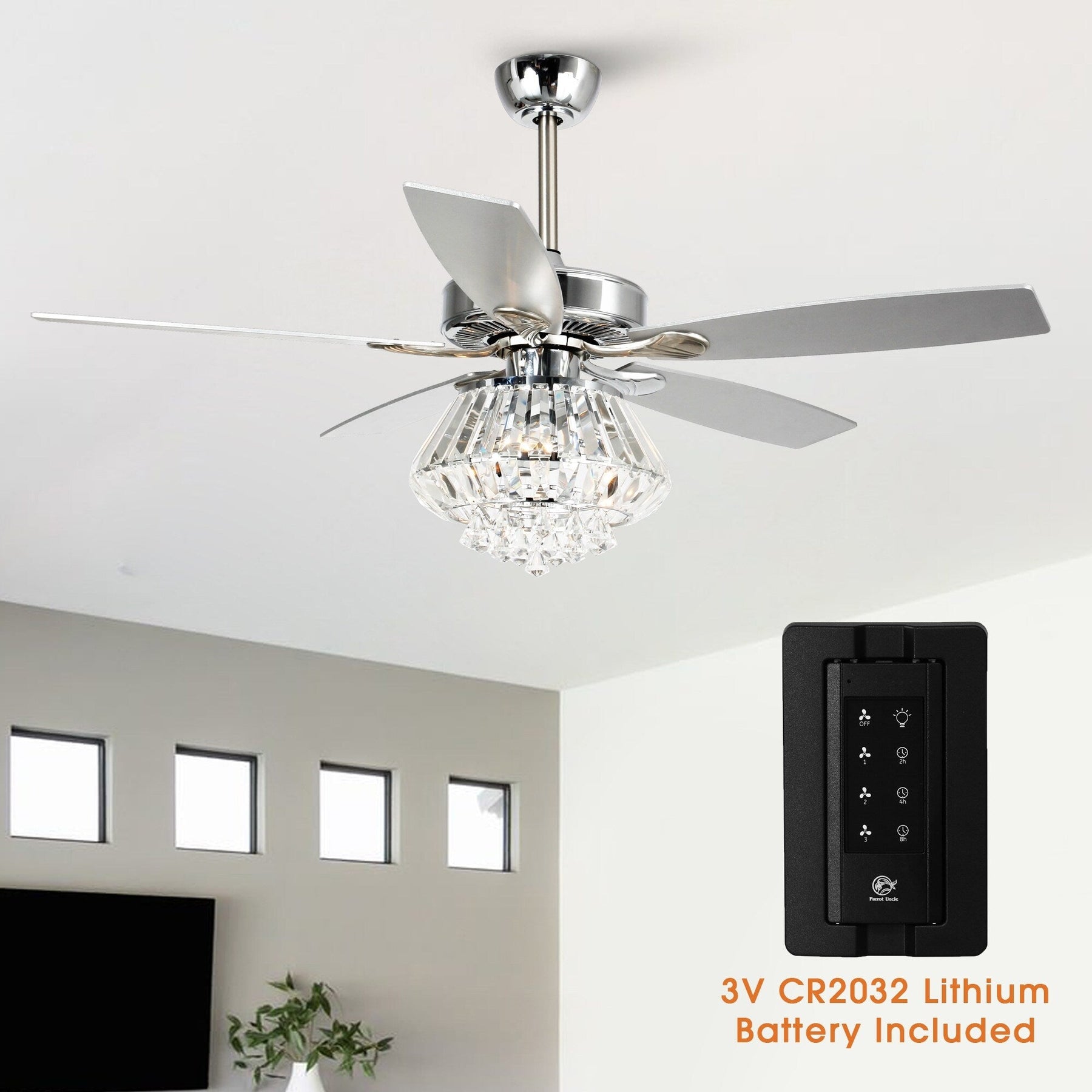 Restez au frais et élégant grâce au ventilateur de plafond moderne chromé de 132 cm avec lustre en cristal et télécommande de Parrot Uncle. Économique et élégant, ce ventilateur de plafond répond à vos besoins de climatisation et d'éclairage grâce à son abat-jour en cristal qui scintille et capte la lumière. Ses pales en bois teinté argenté brassent un volume d'air impressionnant, ce qui en fait le complément idéal à toute pièce. La télécommande incluse facilite le contrôle du moteur à courant alternatif à 3 vitesses et le changement de vitesse. La minuterie permet de régler le ventilateur sur 2, 4 ou 8 heures. Idéal pour les plafonds inclinés jusqu'à 15 degrés.