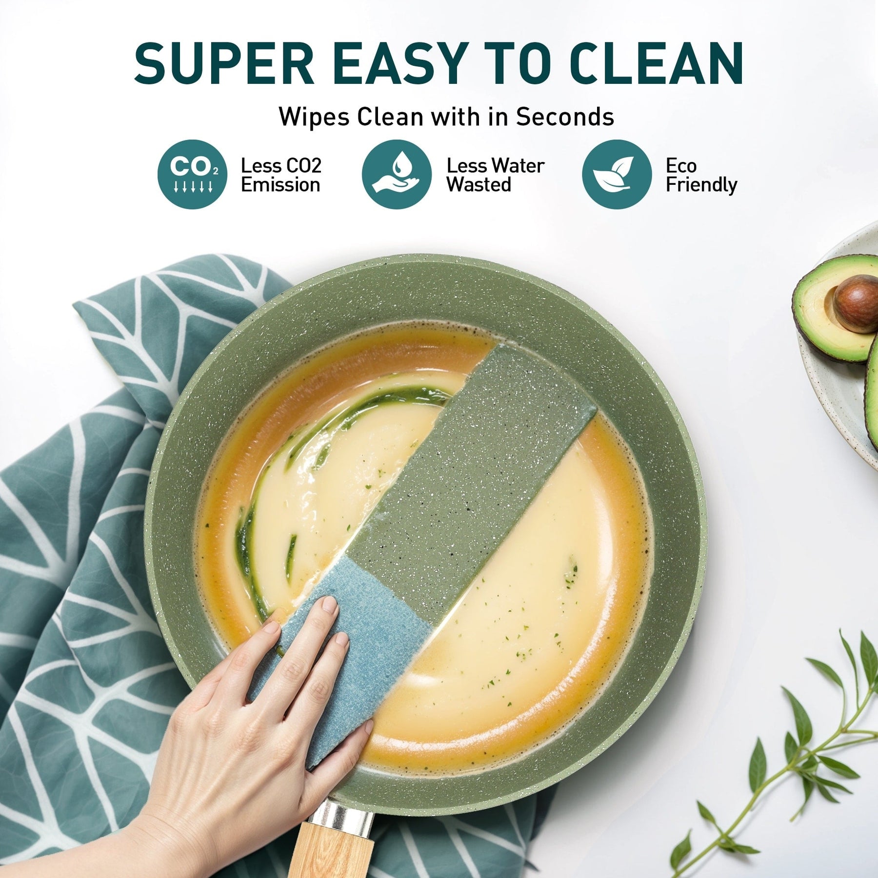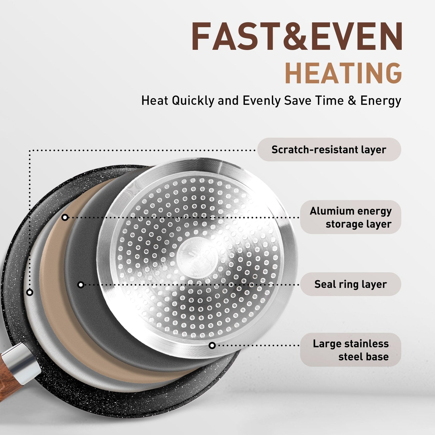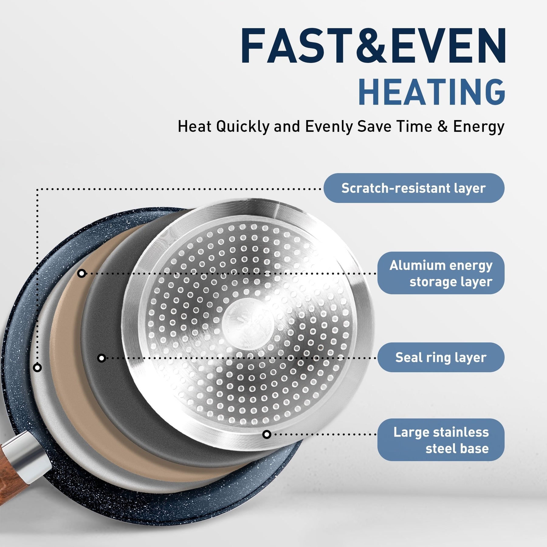 Préparez des plats savoureux avec la batterie de cuisine antiadhésive avec revêtement en granit Kitchen Academy. Chaque pièce est dotée d'un fond en aluminium forgé pour une cuisson uniforme sur tous les feux, y compris l'induction. L'extérieur en granit alimentaire triple couche offre une durabilité et une résistance exceptionnelles à la déformation, tandis que l'intérieur recouvert de marbre naturel facilite la cuisson et le nettoyage. Les poignées en bakélite aspect bois apportent une touche d'élégance à cet ensemble polyvalent.