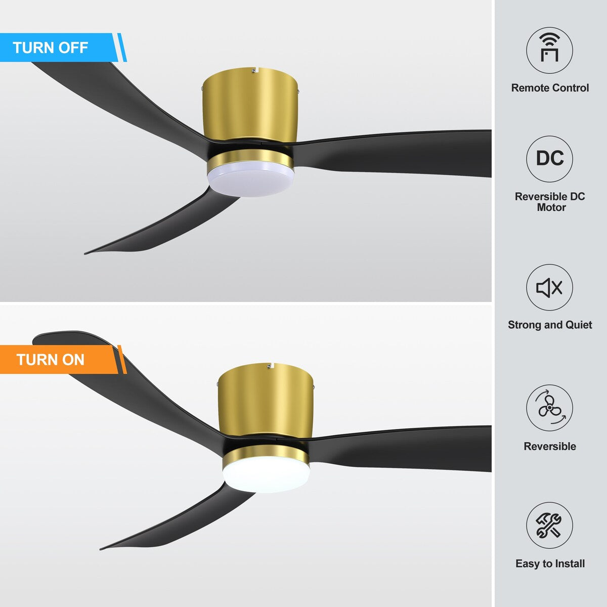 Ce ventilateur de plafond de 13,7 m (52 ​​pi) est équipé d'un moteur CC réversible à 6 vitesses et à économie d'énergie, logé dans un boîtier épuré avec des bras de pales architecturaux supportant 3 pales, et d'un éclairage LED 3000 K. Il se contrôle facilement grâce à la télécommande incluse. Son moteur CC ultra-silencieux est 70 % plus efficace que les ventilateurs CA traditionnels.