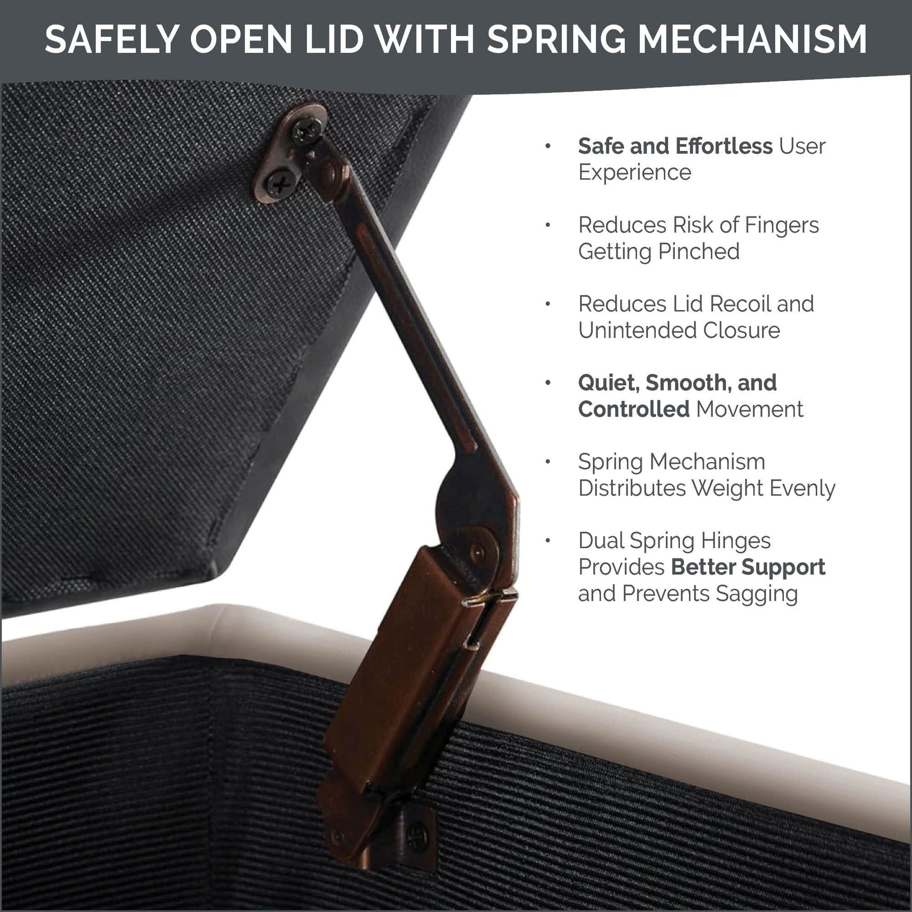• Construction de qualité avec couvercle et côtés rembourrés, pieds en bois massif et mouvement silencieux, fluide et contrôlé à l'aide de charnières à ressort