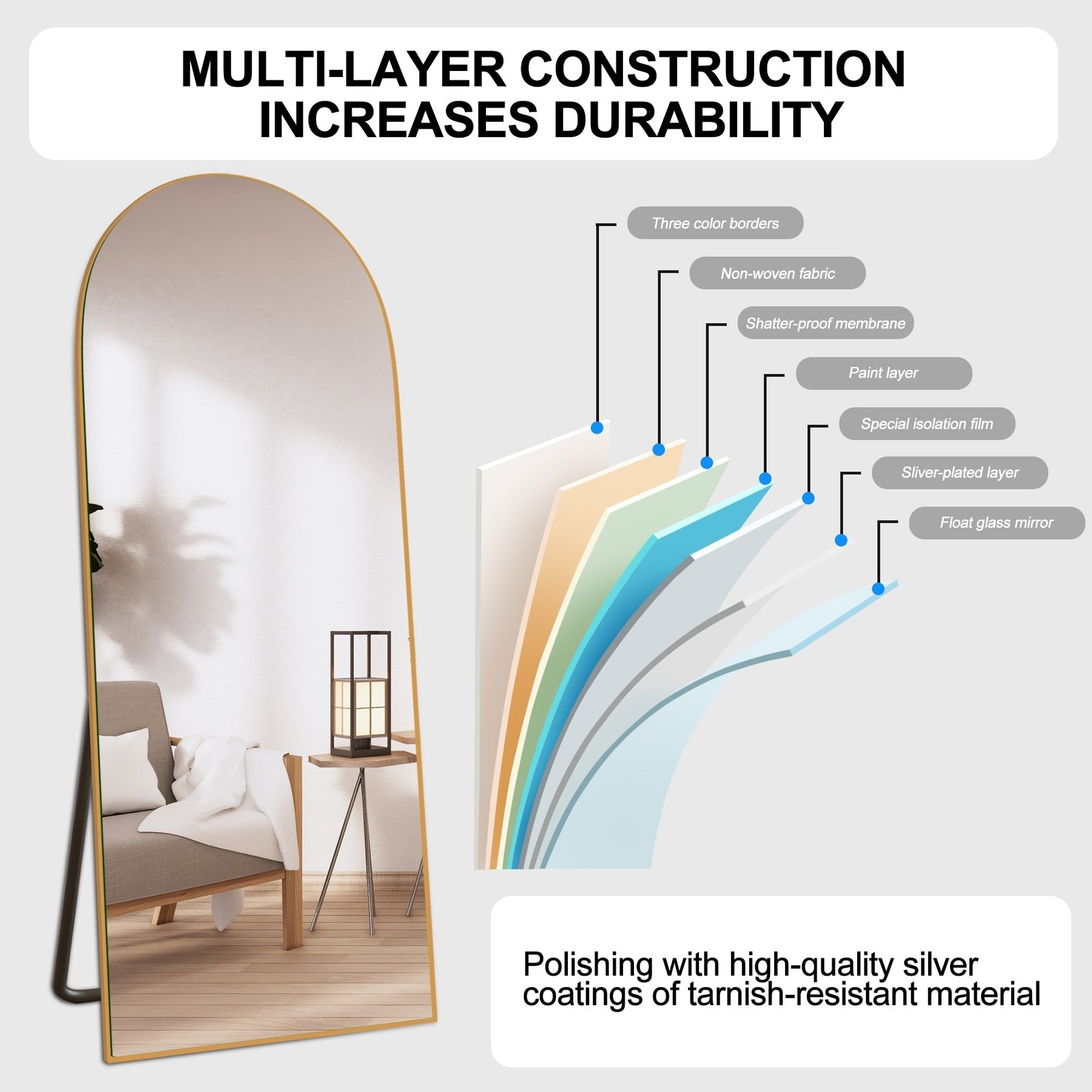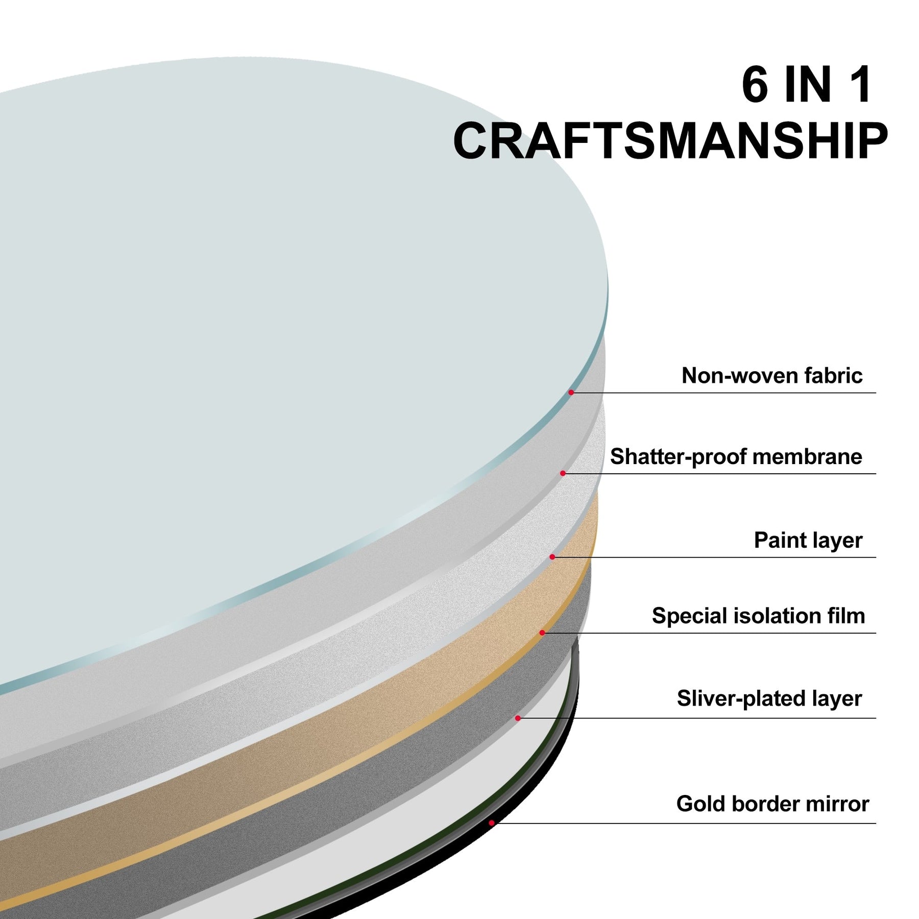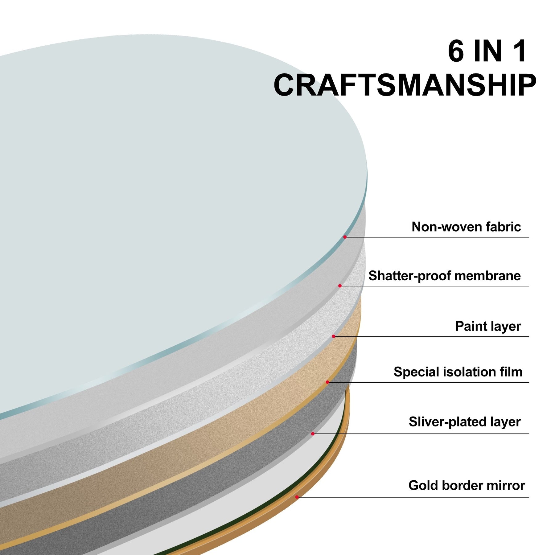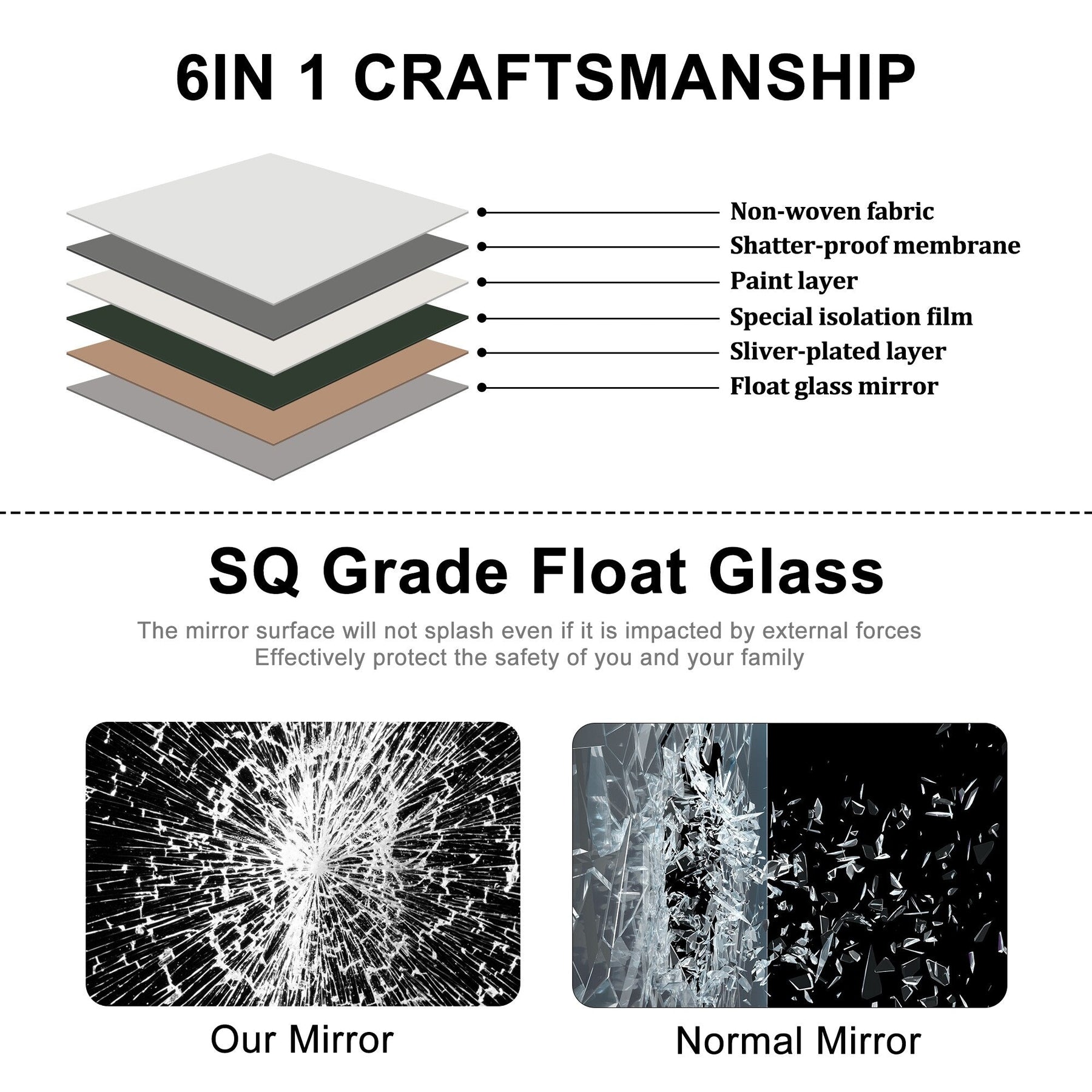 Le miroir de sol arqué adopte une membrane anti-éclaboussures et antidéflagrante, qui peut empêcher les rayures lorsque le verre est accidentellement heurté, améliorant ainsi la sécurité pour vous et votre famille.