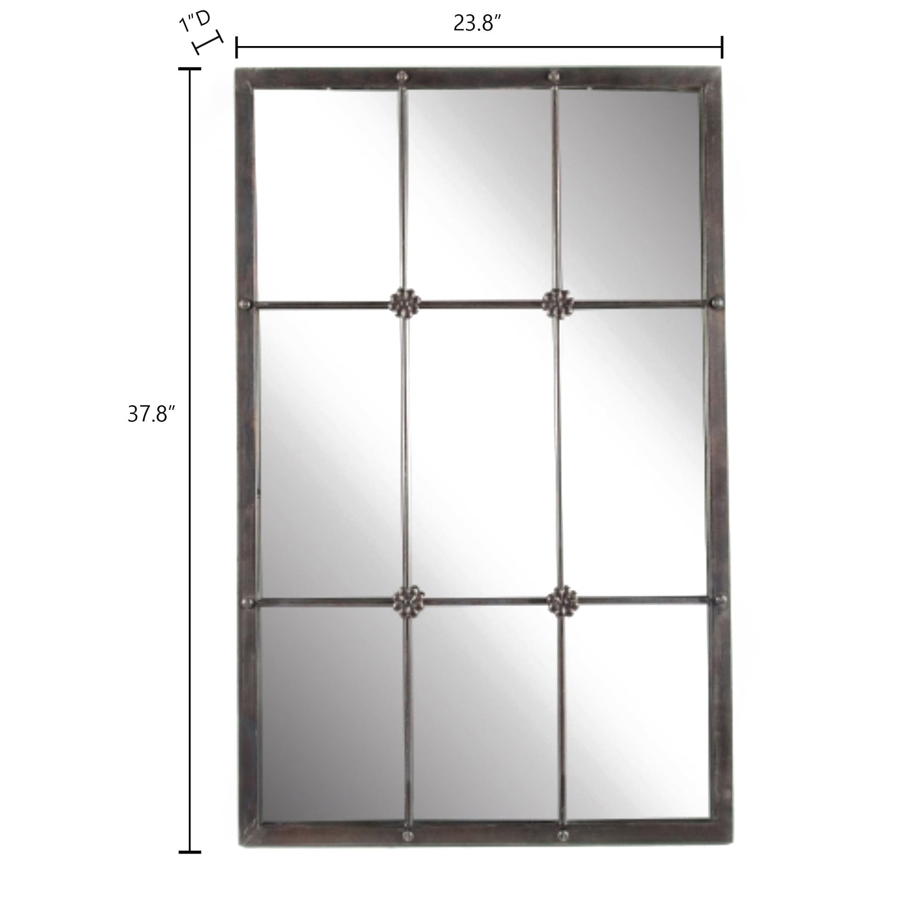 Marre des murs ennuyeux ? Ce miroir mural classique à carreaux apportera instantanément de la lumière à votre intérieur et créera une illusion d'espace. Ce miroir rectangulaire est composé d'un seul morceau de miroir derrière neuf sections de carreaux et est livré prêt à être accroché avec la quincaillerie incluse. Il est prêt à être fixé sur toute surface plane grâce aux languettes métalliques fixées au dos du cadre. Il peut être suspendu horizontalement ou verticalement, selon vos envies. Le cadre est en métal et le miroir est divisé en sections pour imiter une fenêtre. Illuminez votre intérieur avec ce magnifique miroir mural à carreaux. Le miroir est doté d'un cadre en métal à la finition marron rustique. Les carreaux sont ornés d'une fleur en métal au centre. Ce miroir mural sera un point de mire idéal pour votre entrée, votre salon, votre couloir ou votre chambre.