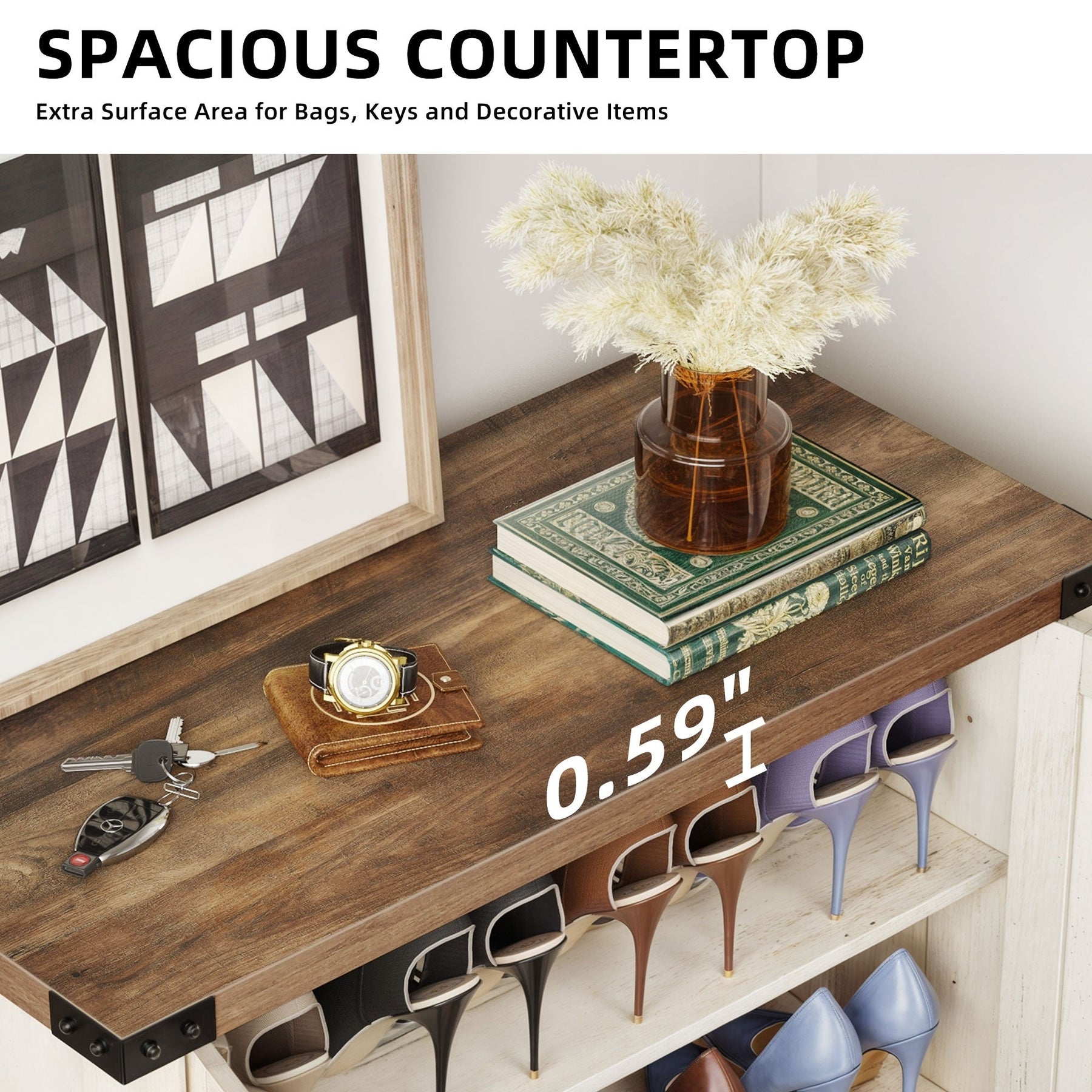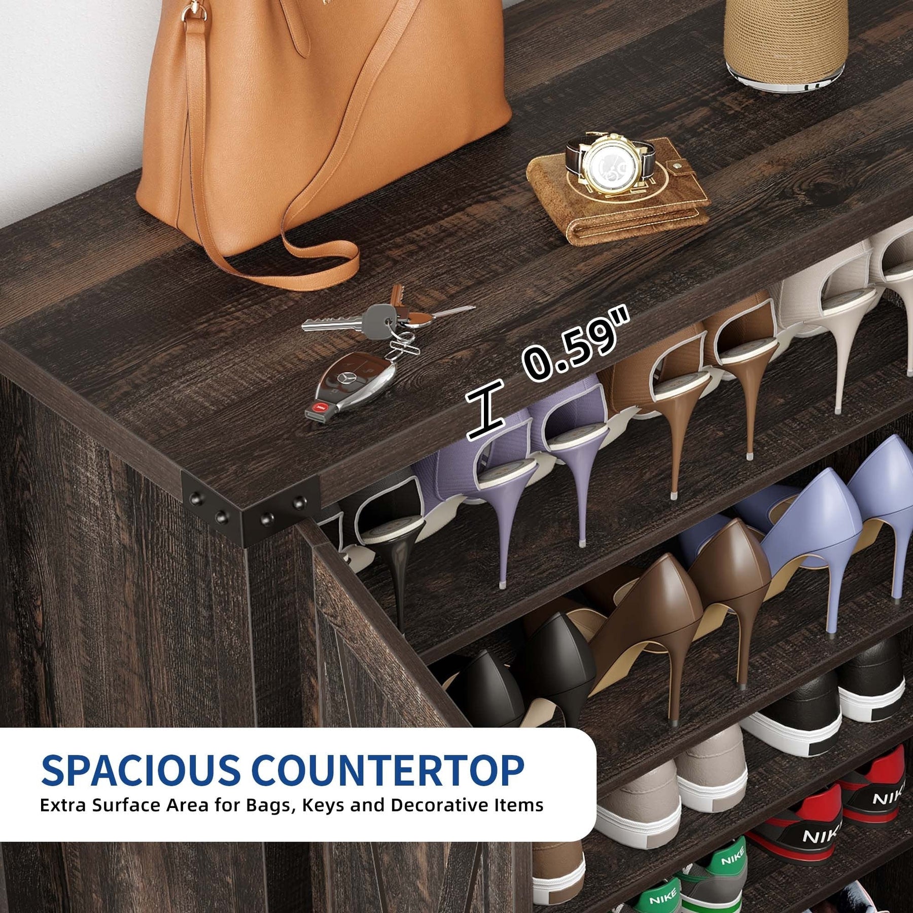 Grand espace de rangement pouvant accueillir 15 à 20 paires de chaussures et petits objets.