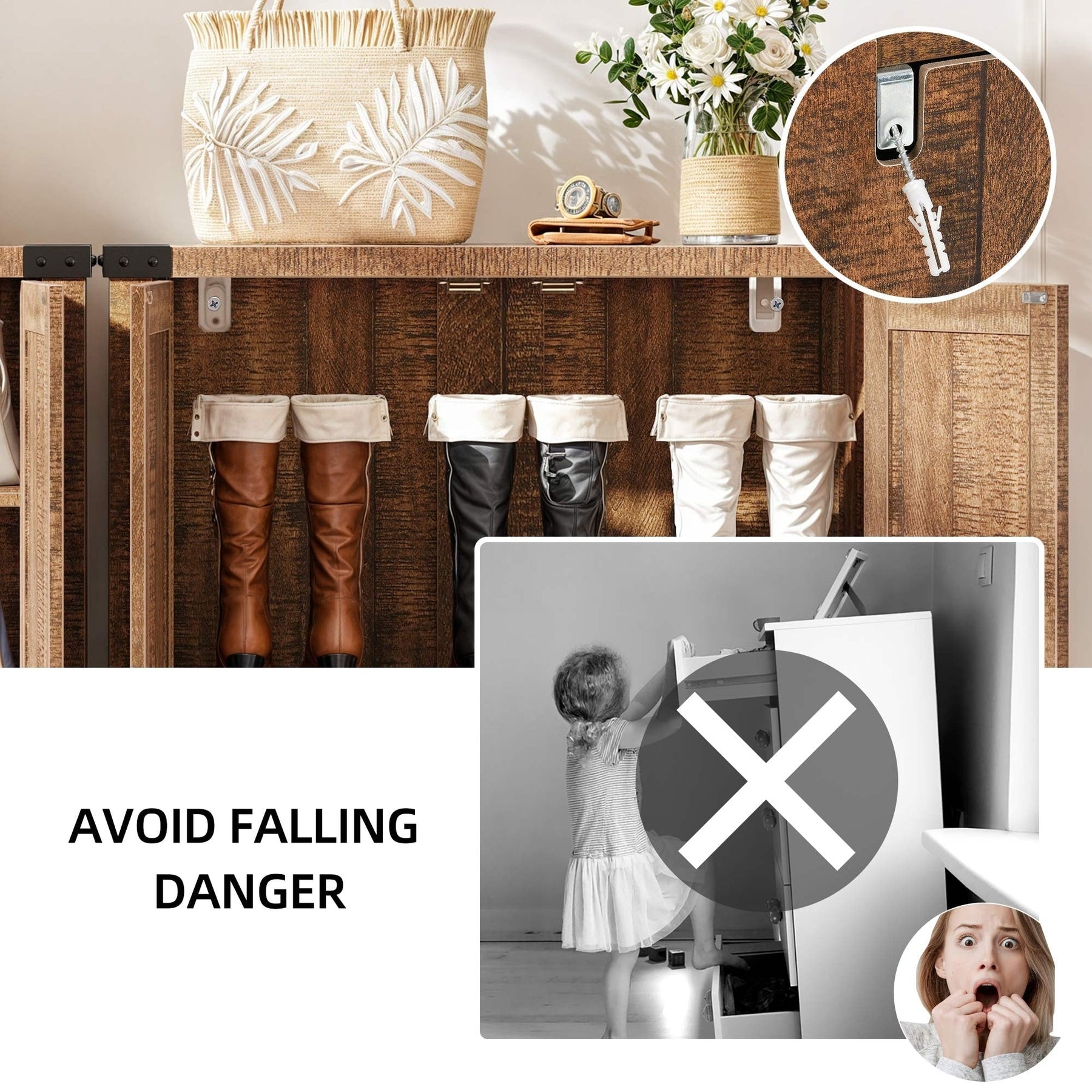 Organisez votre espace avec notre spacieux meuble à chaussures. Avec ses 5 étagères pouvant accueillir 15 à 20 paires de chaussures et son plateau pratique pour les petits objets, il est indispensable à toute maison. Son élégant motif en X lui confère un charme rustique, tandis que ses 1re et 3e étagères réglables accueillent tous types de chaussures. Fabriqué en MDF durable avec des pieds en bois robustes, il est conçu pour une stabilité et une longévité accrues. N'oubliez pas d'installer le kit anti-basculement inclus pour plus de sécurité.