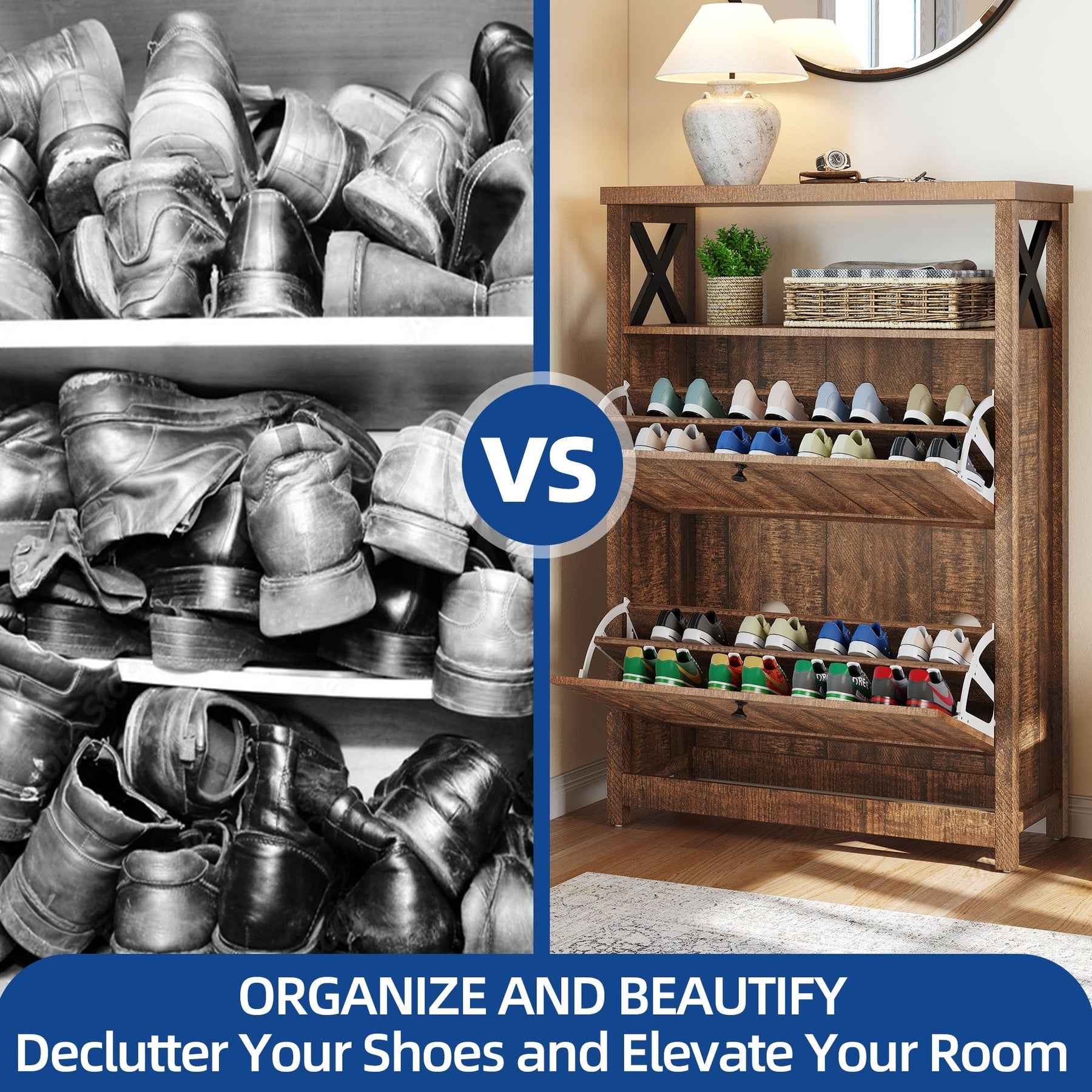 L'armoire à chaussures élancée avec une finition blanc chaud maximise l'espace et élimine l'encombrement.