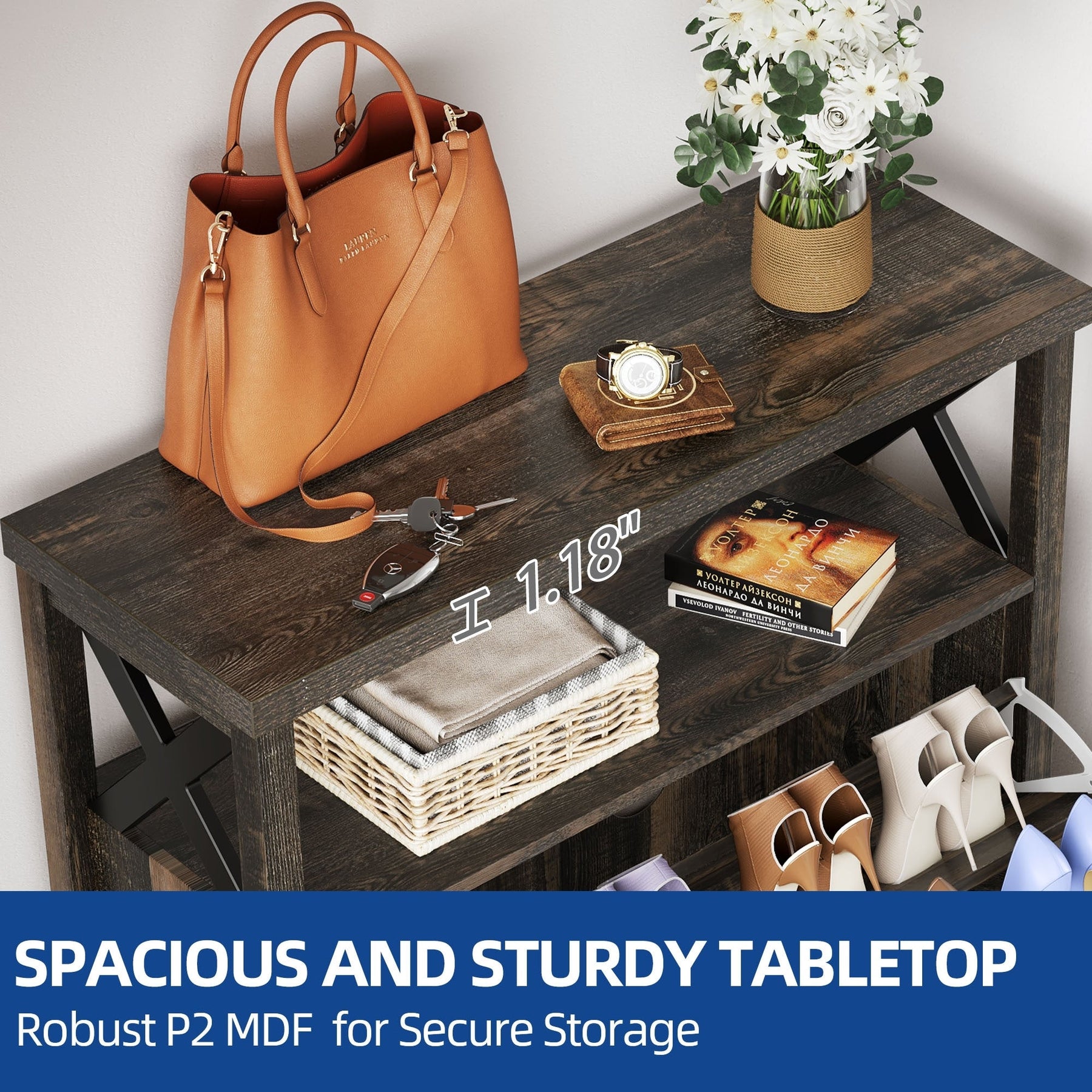 Le rangement supérieur et le compartiment ouvert offrent un accès facile aux essentiels du quotidien.