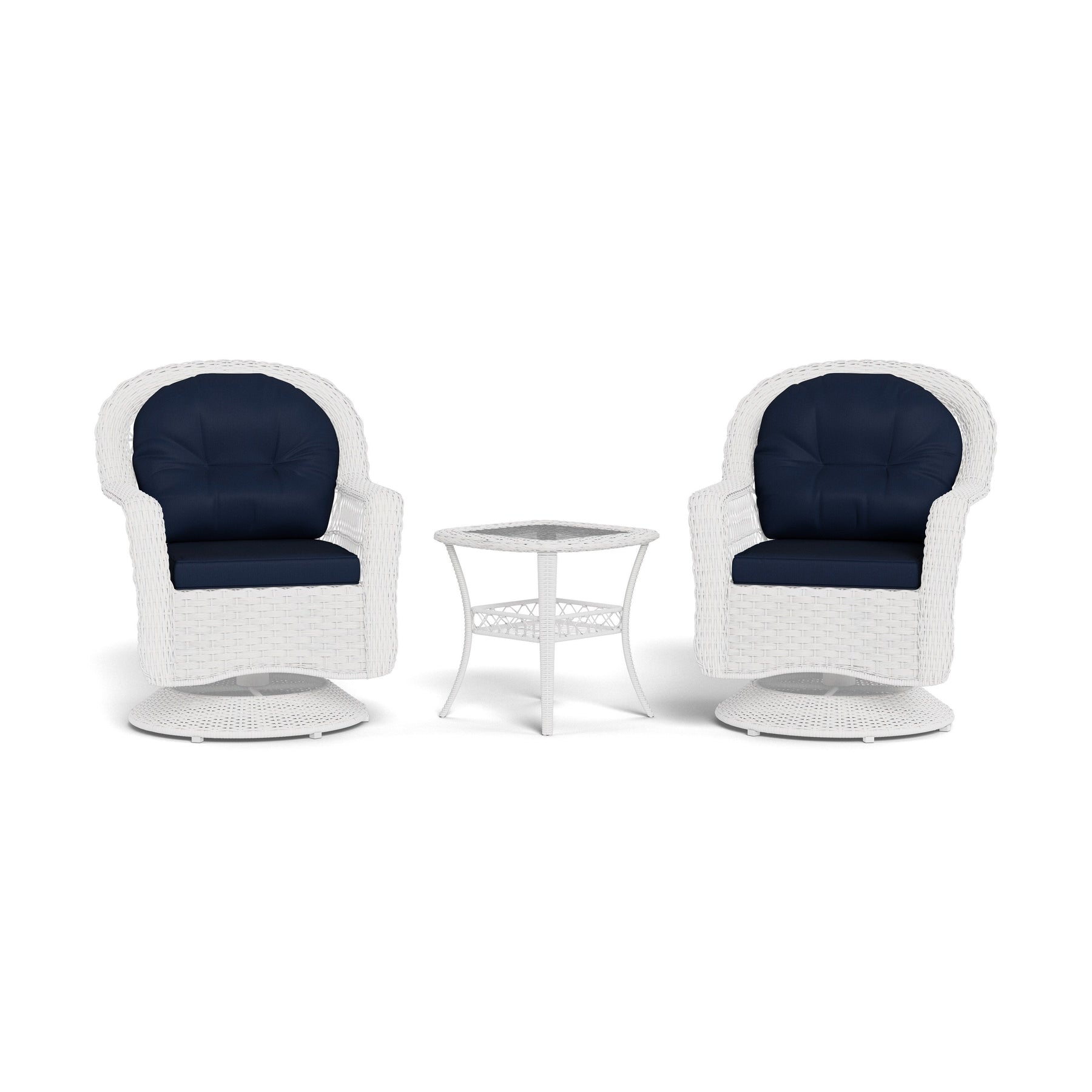 Détendez-vous avec style grâce à l'ensemble de jardin Biloxi Outdoor en osier blanc avec fauteuils pivotants et planeurs. Fabriqué par Tortuga Outdoor, cet ensemble comprend deux fauteuils pivotants et planeurs ainsi qu'une table d'appoint assortie. Sa structure en résine tressée résistante aux intempéries résiste aux taches, aux fissures et aux intempéries, tandis que sa structure thermolaquée garantit une durabilité à long terme. L'ensemble est doté de coussins bleus et d'un plateau en verre trempé avec étagère. Créez un espace extérieur chaleureux avec ce charmant ensemble Biloxi.