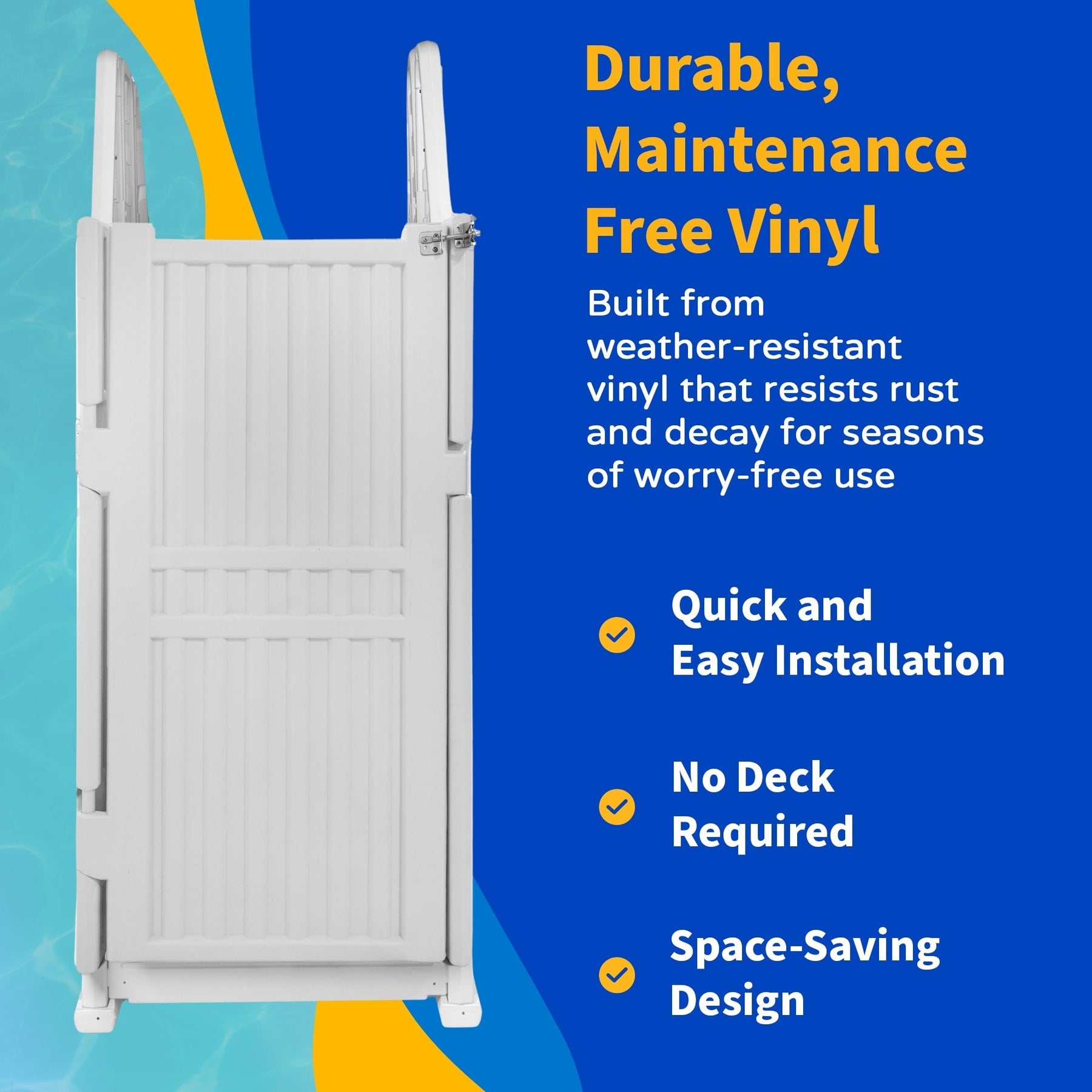 • ENTRÉE SÉCURISÉE - L'escalier extérieur est équipé d'une barrière verrouillable à verrouillage automatique qui se referme automatiquement en cas d'ouverture accidentelle. Pour plus de sécurité, ce système d'escalier est équipé d'un cadenas à clé pour les périodes de non-utilisation de la piscine.
