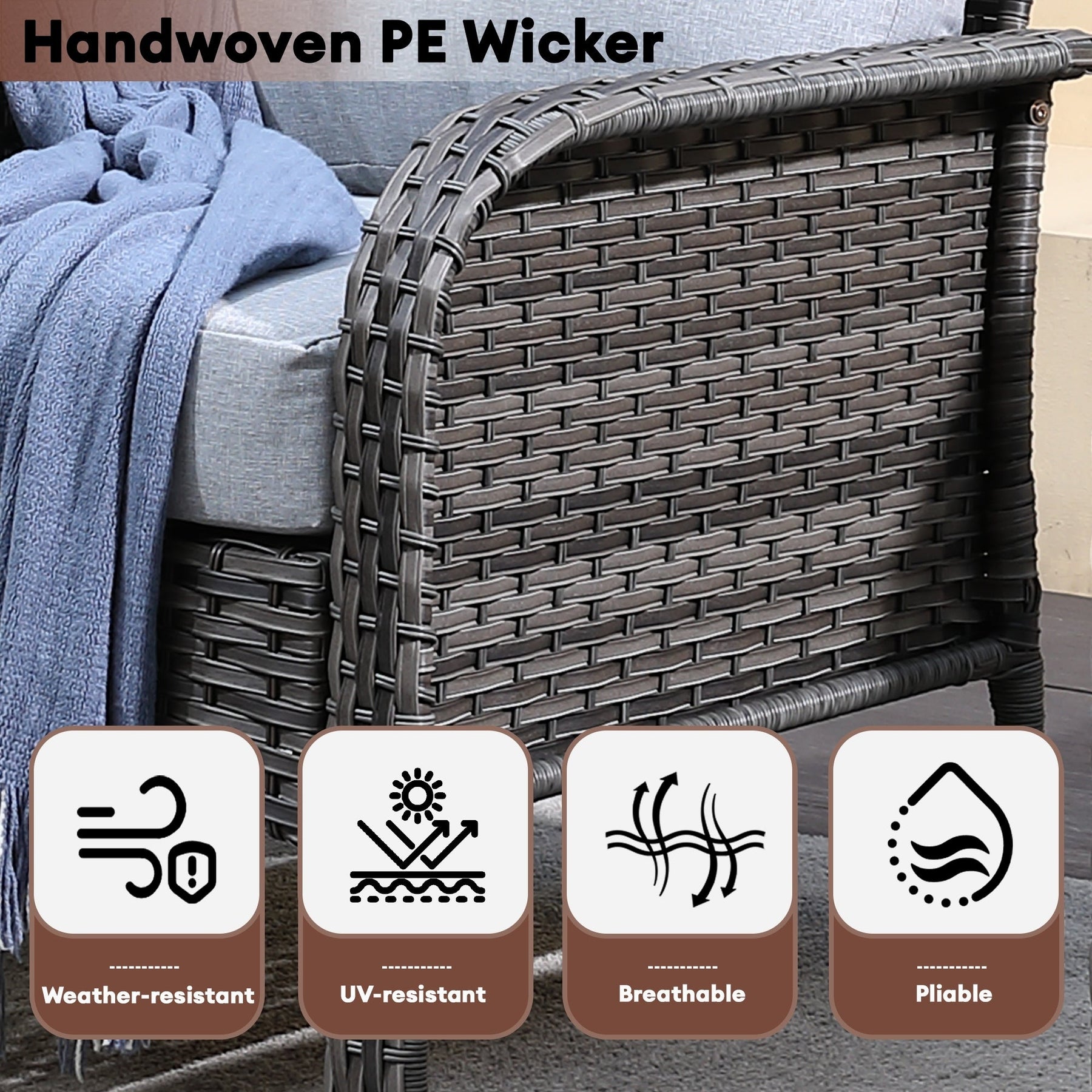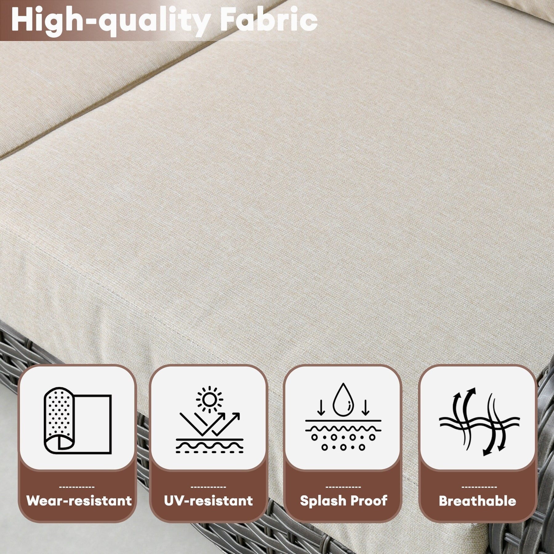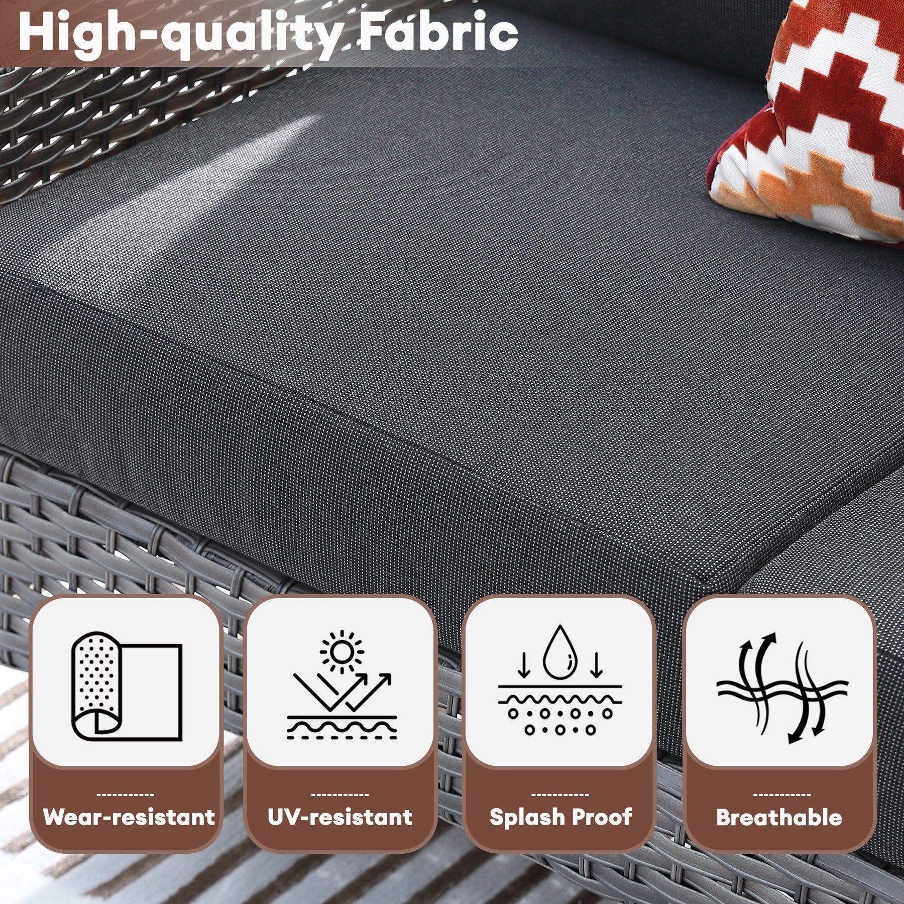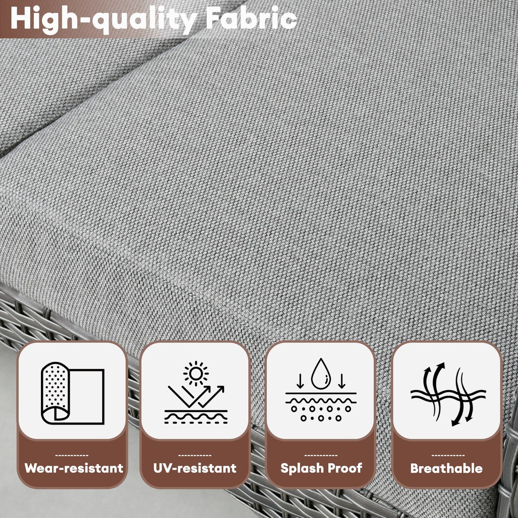 Sa structure robuste en métal thermolaqué et son osier en résine tressée résistant aux intempéries rendent cet ensemble élégant et durable. Ses housses de coussin résistantes aux UV et à l'usure sont idéales pour une utilisation prolongée en extérieur. Ses coussins épais et rembourrés haute résilience vous offrent un confort optimal et une détente optimale. La table à deux niveaux offre un espace de rangement supplémentaire, idéal pour recevoir des amis ou passer des moments conviviaux en famille.