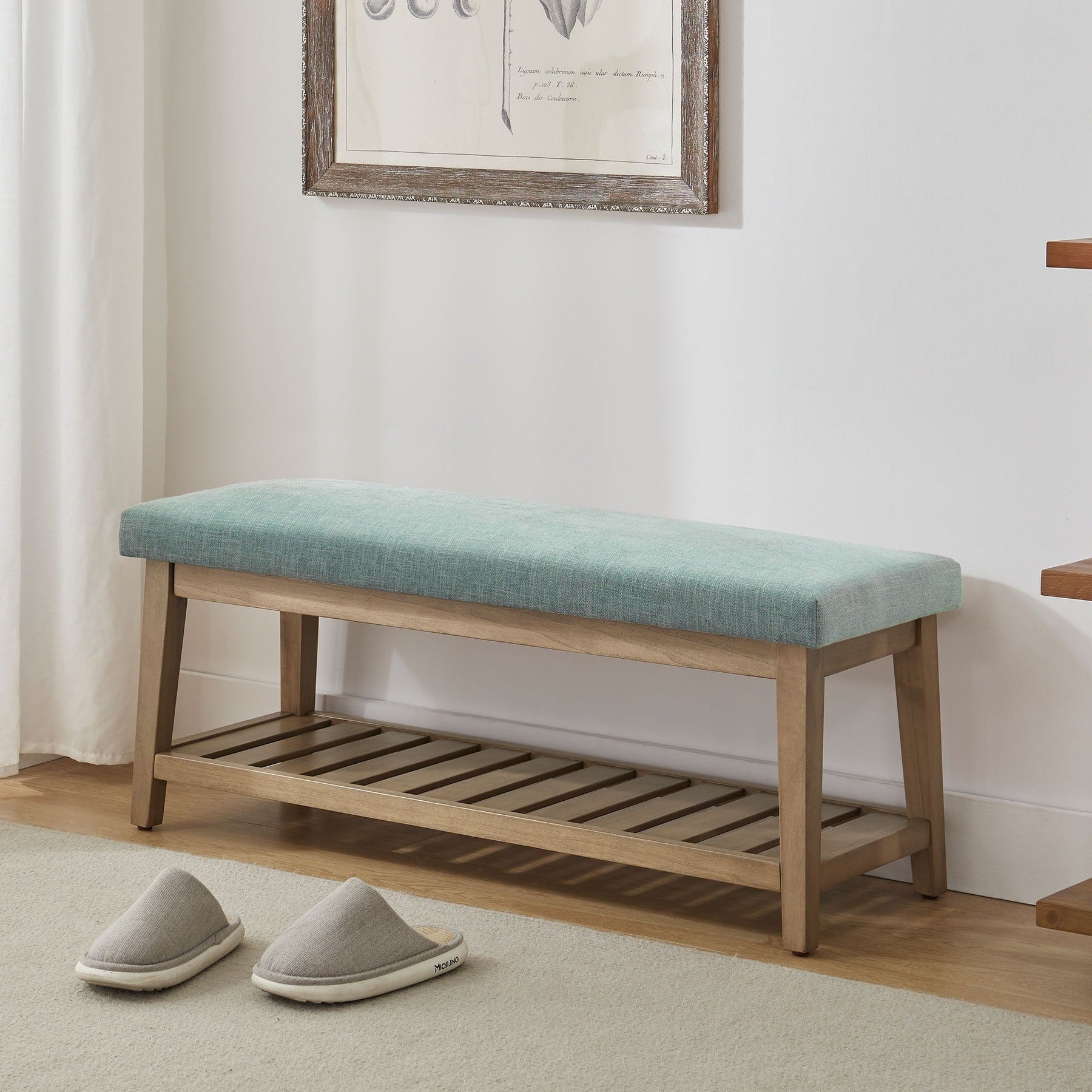 Le tissu en lin doux rencontre le cadre en bois massif dans notre banc élégant