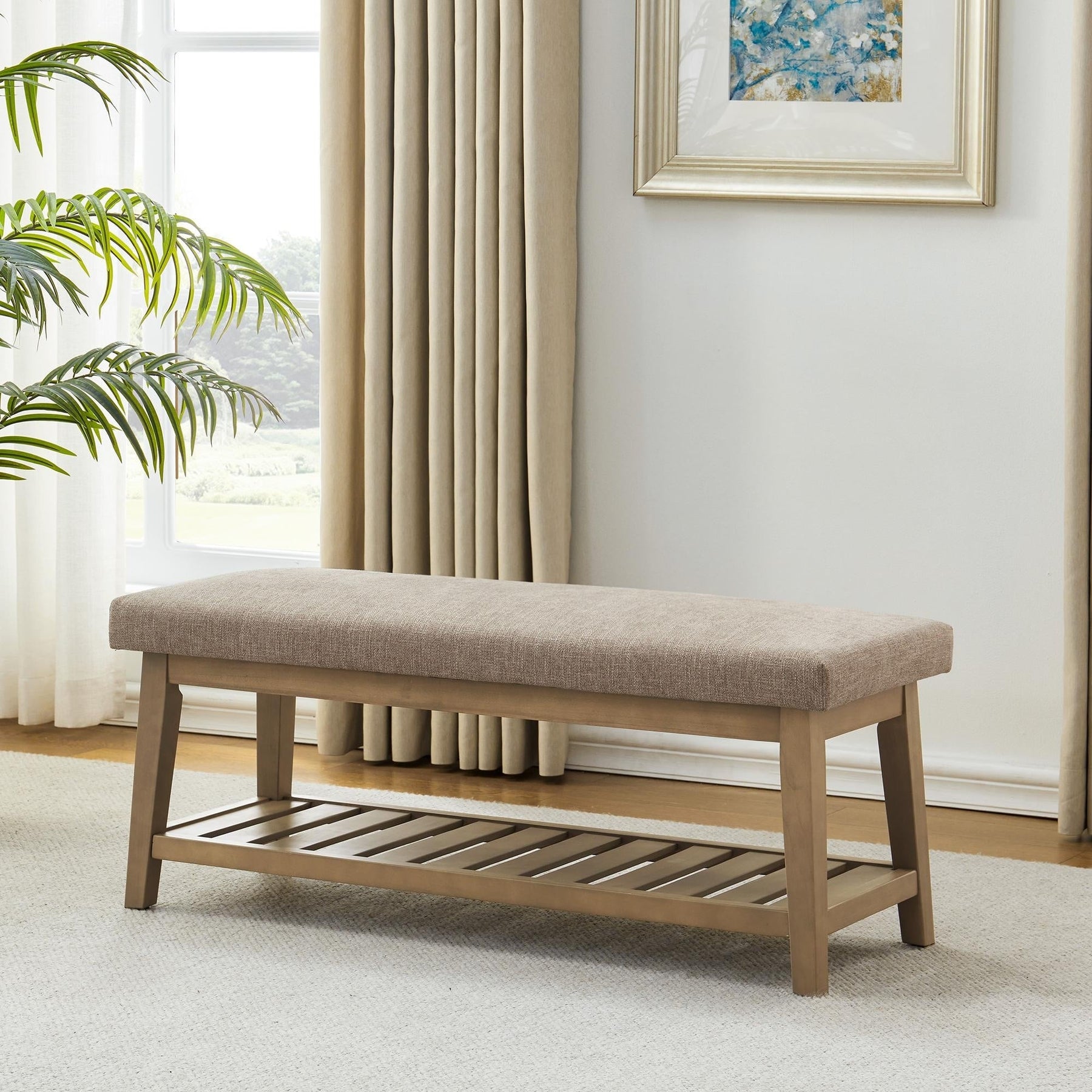 Créez une atmosphère chaleureuse dans votre entrée avec un banc contemporain sans dossier doté d'une tablette de rangement pratique. Son assise rembourrée offre un confort douillet pour enfiler vos chaussures. La tablette inférieure à lattes est idéale pour ranger chaussures et sacs à main, les gardant au-dessus du sol et créant un espace ordonné et ordonné.