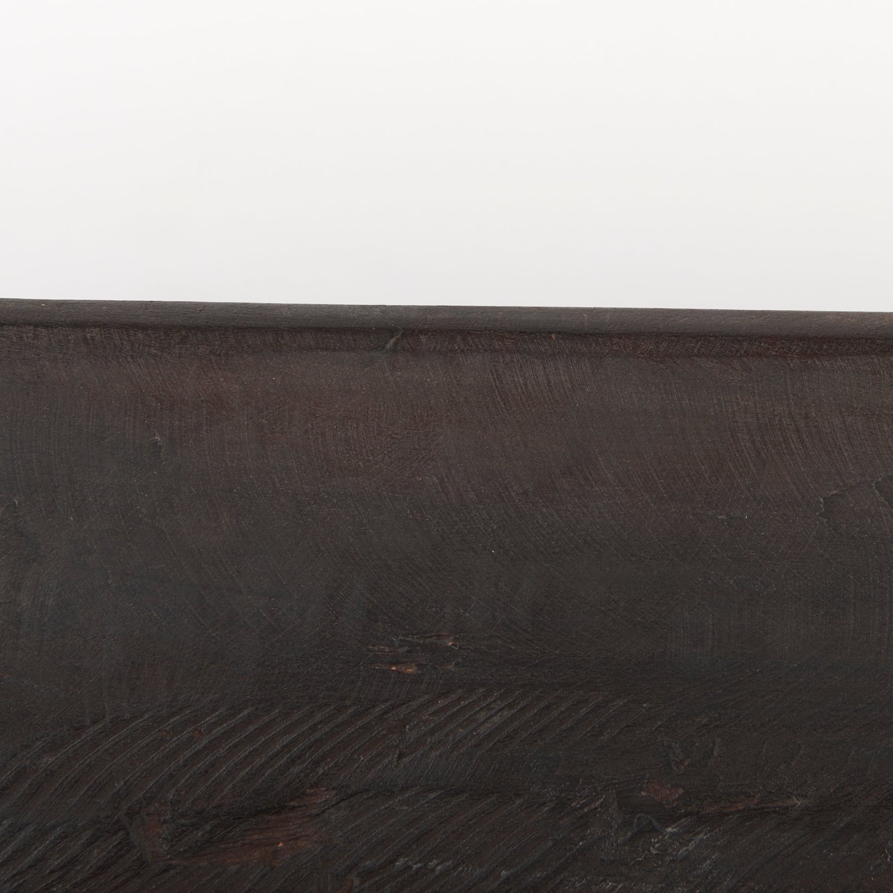 Les textures et rainures naturelles du bois récupéré et des sculptures artisanales sont rehaussées par la finition brun-noir profond.