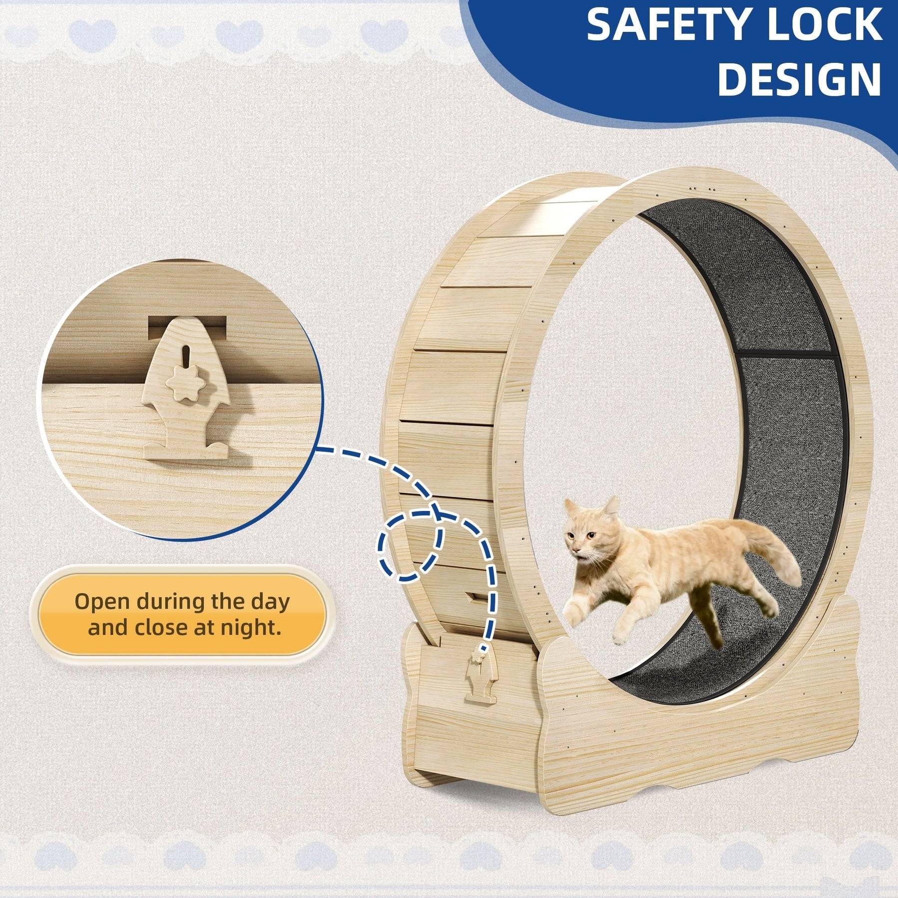 Le tapis de course pour chat est conçu pour répondre aux préférences des chats, stimulant leur envie de jouer et favorisant leur santé globale. Sa structure robuste et durable résiste à un usage quotidien et aux jeux, grâce à sa roue de 91 cm de diamètre et son intérieur antidérapant. Cette roue robuste pour chat offrira des heures de divertissement à votre compagnon félin. De plus, le tapis est équipé d'un loquet de verrouillage à motif d'arêtes de poisson qui verrouille la roue lorsqu'elle n'est pas utilisée, garantissant ainsi un exercice silencieux.
